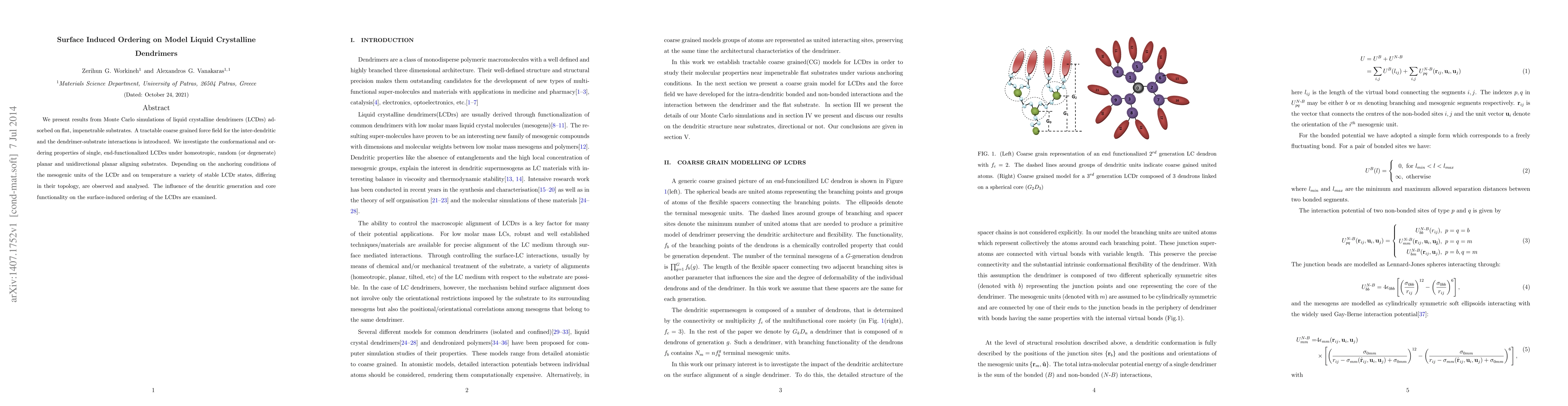 We present results from Monte Carlo simulations of liquid crystalline dendrimers (LCDrs) adsorbed on flat, impenetrable substrates. A tractable coarse grained force field for the inter-dendritic and the dendrimer-substrate interactions is introduced. We investigate the conformational and ordering properties of single, end-functionalized LCDrs under homeotropic, random (or degenerate) planar and unidirectional planar aligning substrates. Depending on the anchoring conditions of the mesogenic units of the LCDr and on temperature a variety of stable LCDr states, differing in their topology, are observed and analysed. The influence of the denritic generation and core functionality on the surface-induced ordering of the LCDrs are examined.