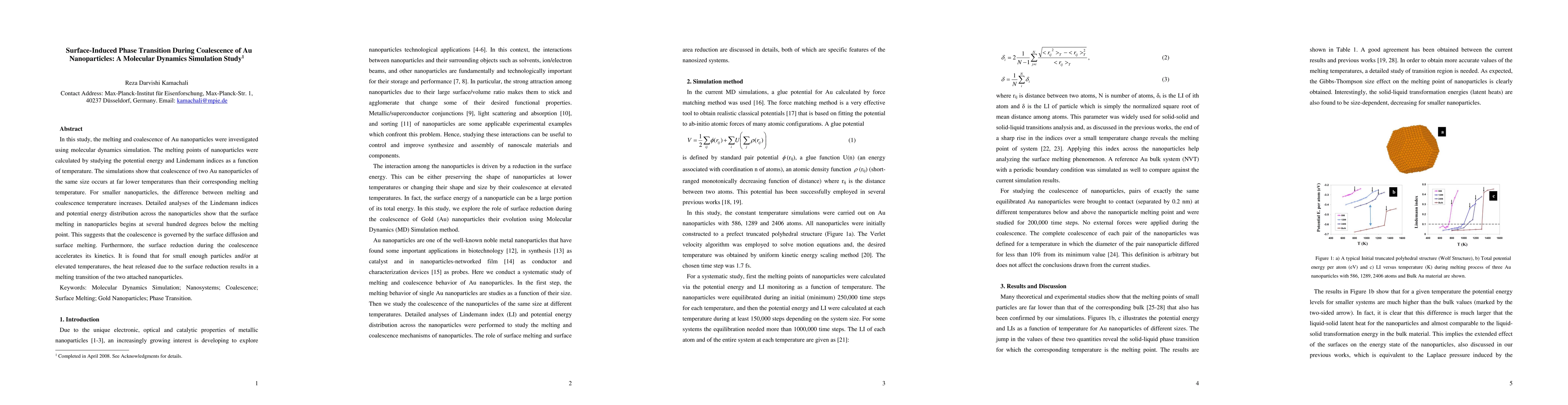 Molecular dynamics simulations were employed to study the melting and coalescence of Au nanoparticles, calculating melting points via potential energy and Lindemann indices (LIs) as functions of temperature.
