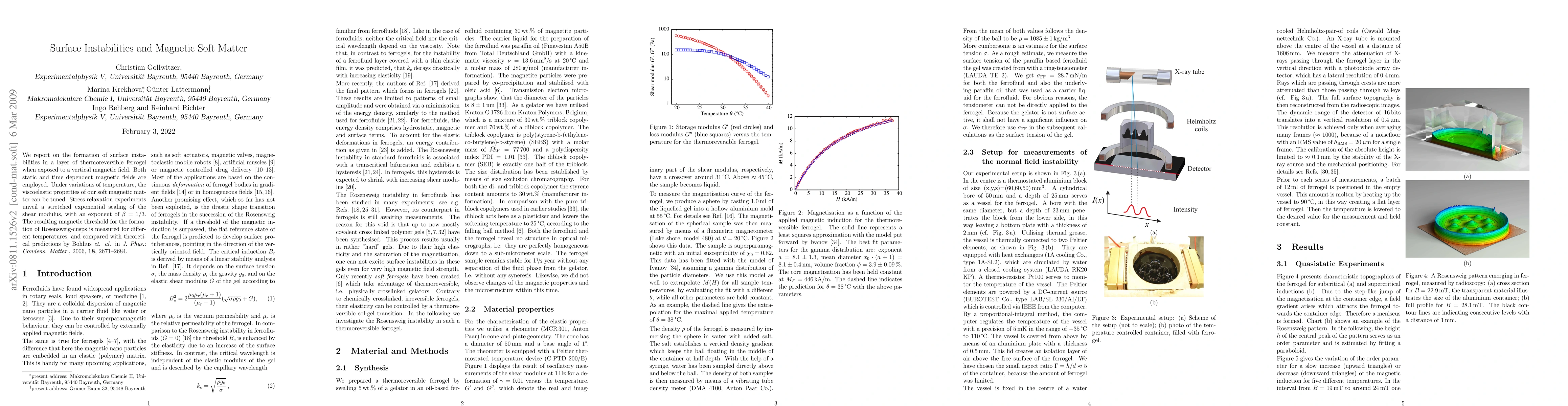 We report on the formation of surface instabilities in a layer of thermoreversible ferrogel when exposed to a vertical magnetic field. Both static and time dependent magnetic fields are employed. Under variations of temperature, the viscoelastic properties of our soft magnetic matter can be tuned. Stress relaxation experiments unveil a stretched exponential scaling of the shear modulus, with an exponent of beta=1/3. The resulting magnetic threshold for the formation of Rosensweig-cusps is measured for different temperatures, and compared with theoretical predictions by Bohlius et. al. in J. Phys.: Condens. Matter., 2006, 18, 2671-2684.