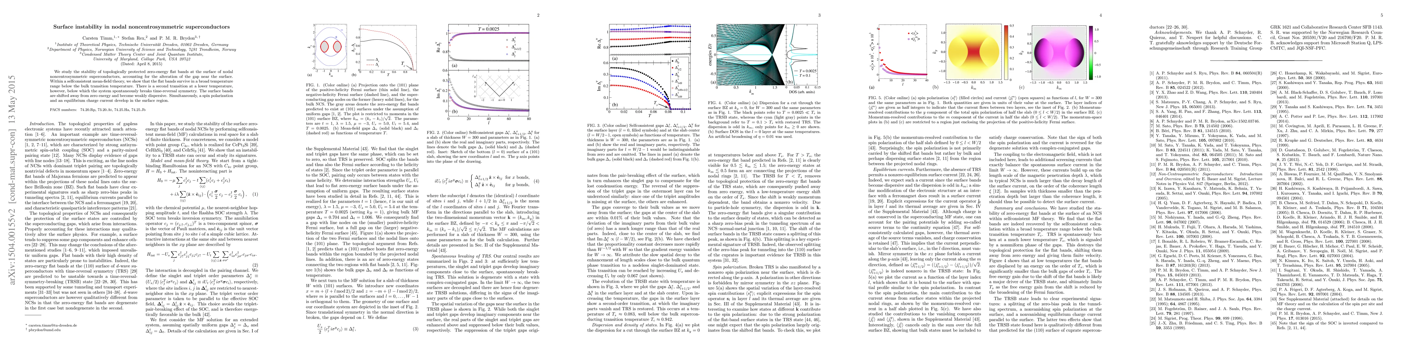 This research explores the stability of topologically protected zero-energy flat bands in nodal noncentrosymmetric superconductors, revealing that while these bands persist below the bulk transition temperature, a second transition at a lower temperature induces spontaneous time-reversal symmetry breaking, shifting the surface bands and generating spin polarization and charge current.
