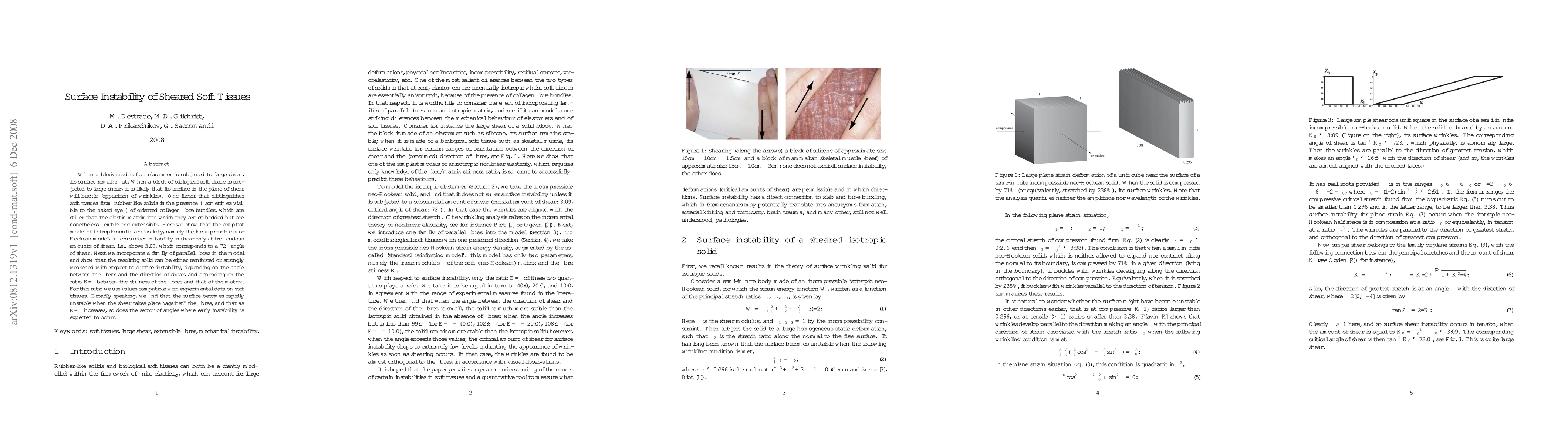 This paper investigates the surface instability of sheared soft tissues, showing that biological soft tissues are prone to surface buckling under shear due to the presence of oriented collagen fibres. The study finds that the neo-Hookean model exhibits significant surface instability only at extreme shear angles, but the inclusion of parallel fibres can greatly influence this instability, with shear against the fibres leading to rapid instability.
