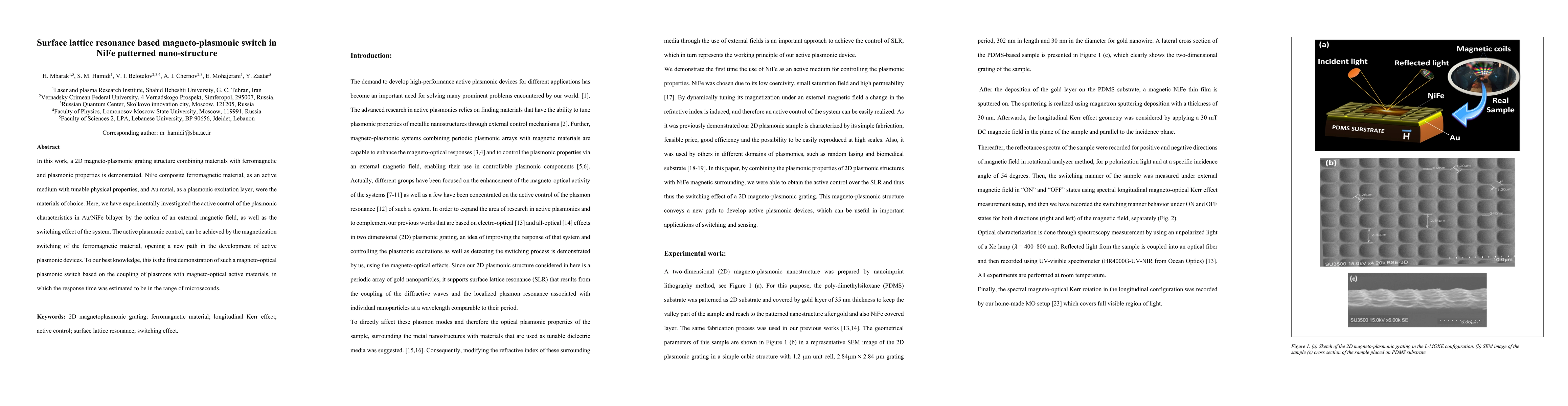 This paper demonstrates a 2D magneto-plasmonic grating structure using NiFe and Au materials, showing active control of plasmonic characteristics via an external magnetic field. The study reveals a magneto-optical plasmonic switch based on surface lattice resonance, with a response time in microseconds.