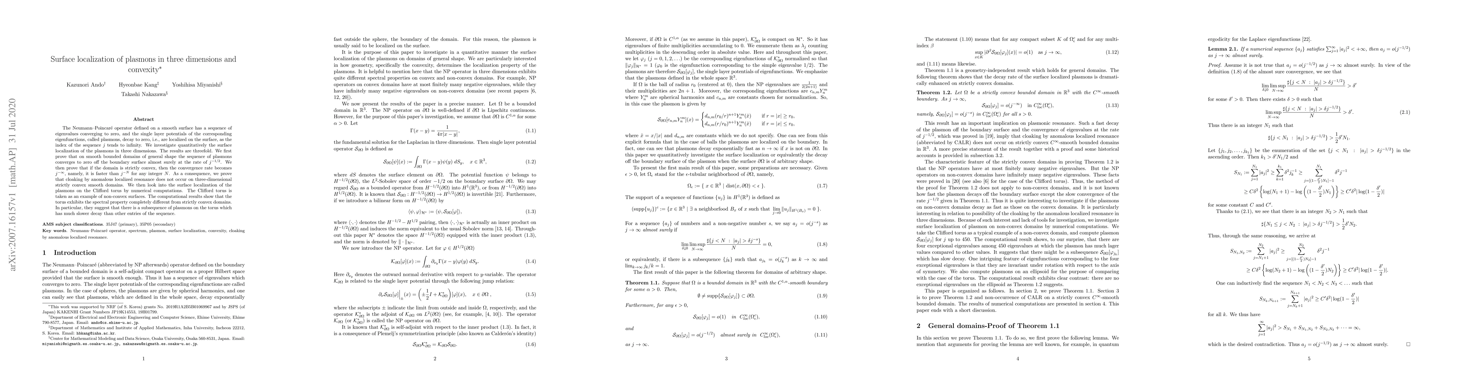 The Neumann--Poincar\'e operator defined on a smooth surface has a sequence of eigenvalues converging to zero, and the single layer potentials of the corresponding eigenfunctions, called plasmons, decay to zero, i.e., are localized on the surface, as the index of the sequence $j$ tends to infinity. We investigate quantitatively the surface localization of the plasmons in three dimensions. The results are threefold. We first prove that on smooth bounded domains of general shape the sequence of plasmons converges to zero off the boundary surface almost surely at the rate of $j^{-1/2}$. We then prove that if the domain is strictly convex, then the convergence rate becomes $j^{-\infty}$, namely, it is faster than $j^{-N}$ for any integer $N$. As a consequence, we prove that cloaking by anomalous localized resonance does not occur on three-dimensional strictly convex smooth domains. We then look into the surface localization of the plasmons on the Clifford torus by numerical computations. The Clifford torus is taken as an example of non-convex surfaces. The computational results show that the torus exhibits the spectral property completely different from strictly convex domains. In particular, they suggest that there is a subsequence of plasmons on the torus which has much slower decay than other entries of the sequence.