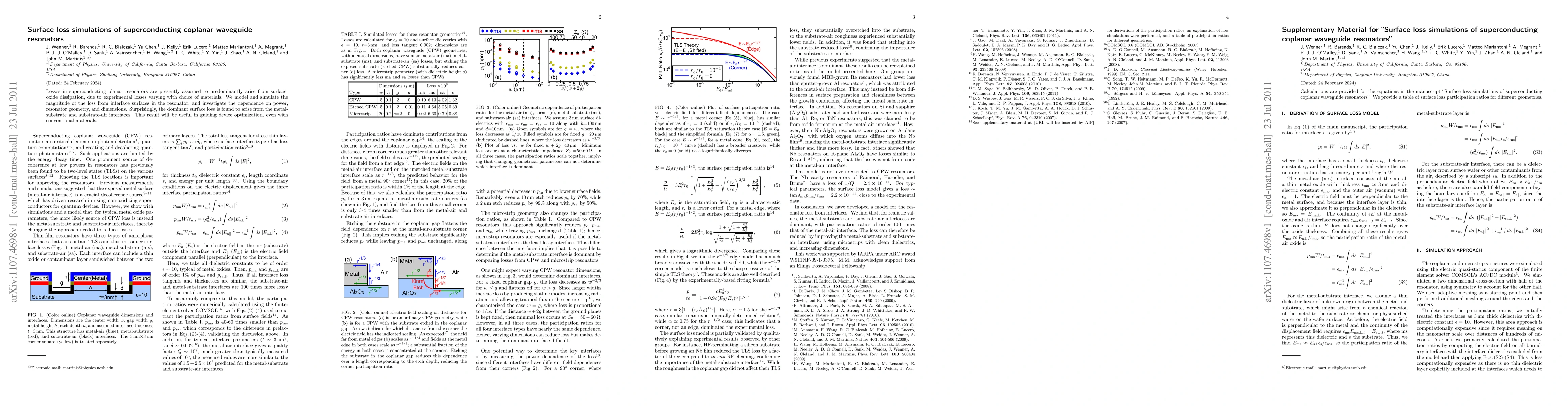 This study simulates surface losses in superconducting coplanar waveguide resonators, revealing that the primary loss mechanism is not from surface-oxide dissipation but from metal-substrate and substrate-air interfaces. This insight can aid in optimizing device performance using conventional materials.