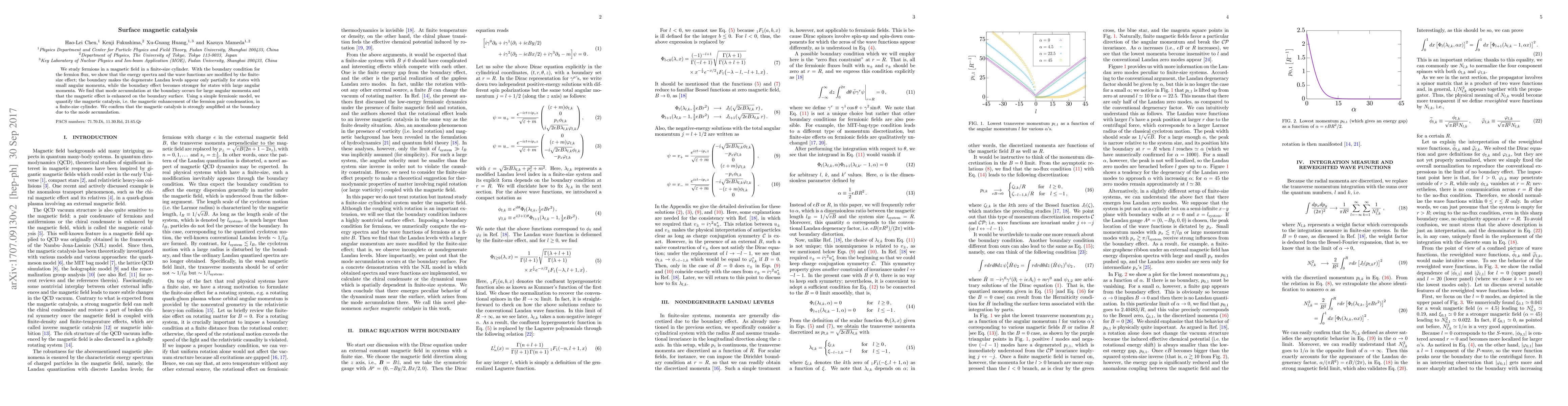 We study fermions in a magnetic field in a finite size cylinder. With the boundary condition for the fermion flux, we show that the energy spectra and the wave-functions are modified by the finite size effect; the boundary makes the degenerate Landau levels appear only partially for states with small angular momenta, while the boundary effect becomes stronger for states with large angular momenta. We find that mode accumulation at the boundary occurs for large angular momenta and the magnetic effect is enhanced on the boundary surface. Using a simple fermionic model, we quantify the magnetic catalysis, i.e. the magnetic enhancement of the fermion pair condensation, in a finite size cylinder. We confirm that the magnetic catalysis is strongly amplified at the boundary due to the mode accumulation.