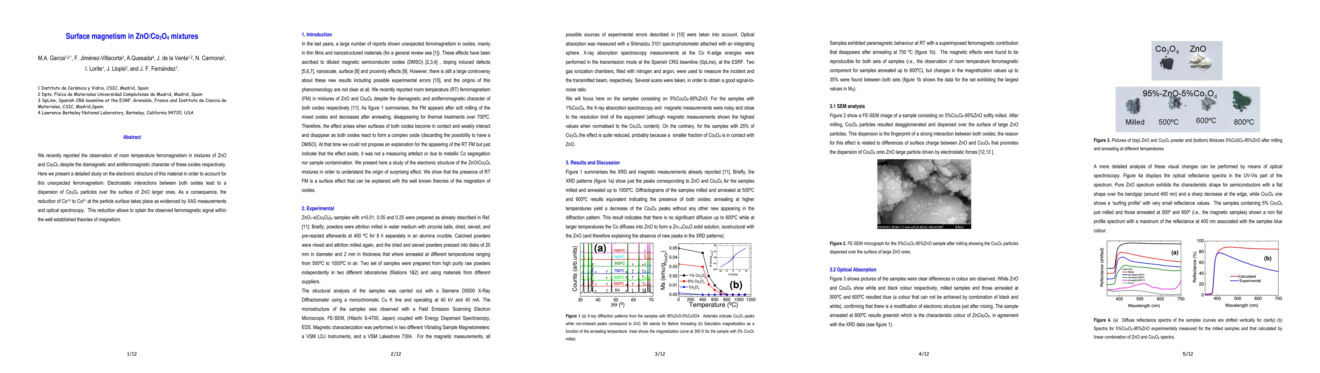 We recently reported the observation of room temperature ferromagnetism in mixtures of ZnO and Co3O4 despite the diamagnetic and antiferromagnetic character of these oxides respectively. Here we present a detailed study on the electronic structure of this material in order to account for this unexpected ferromagnetism. Electrostatic interactions between both oxides lead to a dispersion of Co3O4 particles over the surface of ZnO larger ones. As a consequence, the reduction of Co+3 to Co2+ at the particle surface takes place as evidenced by XAS measurements and optical spectrocopy. This reduction allows to xplain the observed ferromagnetic signal within the well established theories of magnetism.