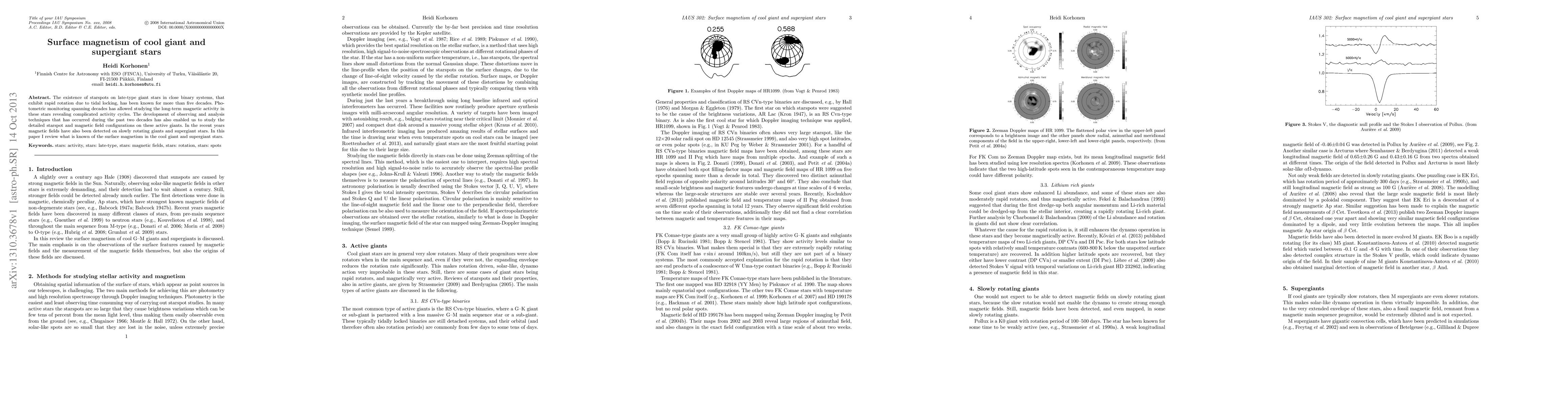 The paper reviews the known surface magnetism in cool giant and supergiant stars, utilizing data from photometric monitoring, Doppler imaging, Zeeman Doppler imaging, and low-resolution spectra.