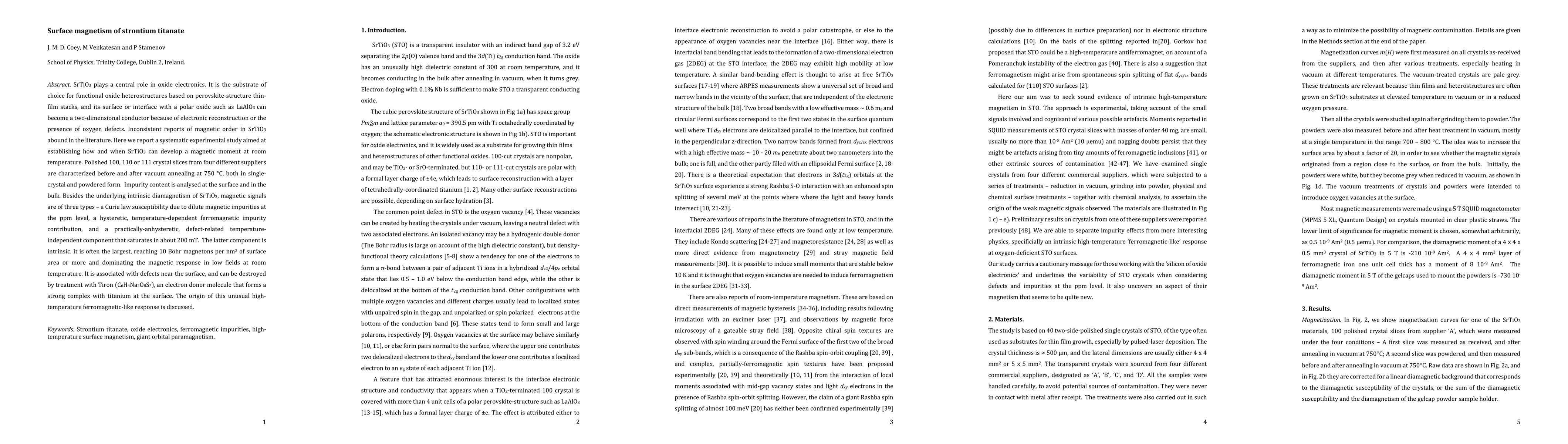 SrTiO3 plays a central role in oxide electronics. It is the substrate of choice for functional oxide heterostructures based on perovskite-structure thin-film stacks, and its surface or interface with a polar oxide such as LaAlO3 can become a two-dimensional conductor because of electronic reconstruction or the presence of oxygen defects. Inconsistent reports of magnetic order in SrTiO3 abound in the literature. Here we report a systematic experimental study aimed at establishing how and when SrTiO3 can develop a magnetic moment at room temperature. Polished 100, 110 or 111 crystal slices from four different suppliers are characterized before and after vacuum annealing at 750 {\deg}C, both in single-crystal and powdered form. Impurity content is analysed at the surface and in the bulk. Besides the underlying intrinsic diamagnetism of SrTiO3, magnetic signals are of three types-a Curie law susceptibility due to dilute magnetic impurities at the ppm level, a hysteretic, temperature-dependent ferromagnetic impurity contribution, and a practically-anhysteretic, defect-related temperature-independent component that saturates in about 200 mT. The latter component is intrinsic. It is often the largest, reaching 10 Bohr magnetons per nm2 of surface area or more and dominating the magnetic response in low fields at room temperature. It is associated with defects near the surface, and can be destroyed by treatment with Tiron (C6H4Na2O8S2), an electron donor molecule that forms a strong complex with titanium at the surface. The origin of this unusual high-temperature ferromagnetic-like response is discussed.