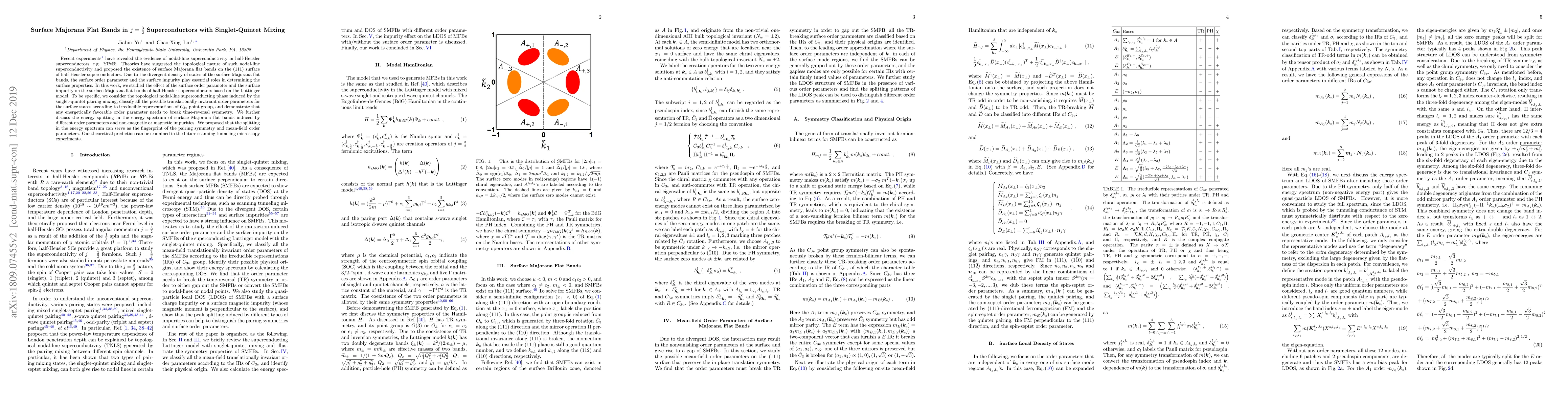 This paper investigates the topological properties of Majorana flat bands on the (111) surface of $j=\frac{3}{2}$ superconductors, focusing on the effects of surface order parameters and impurities. It proposes that energy splitting in the spectrum can reveal pairing symmetry and order parameters, with potential experimental verification via scanning tunneling microscopy.