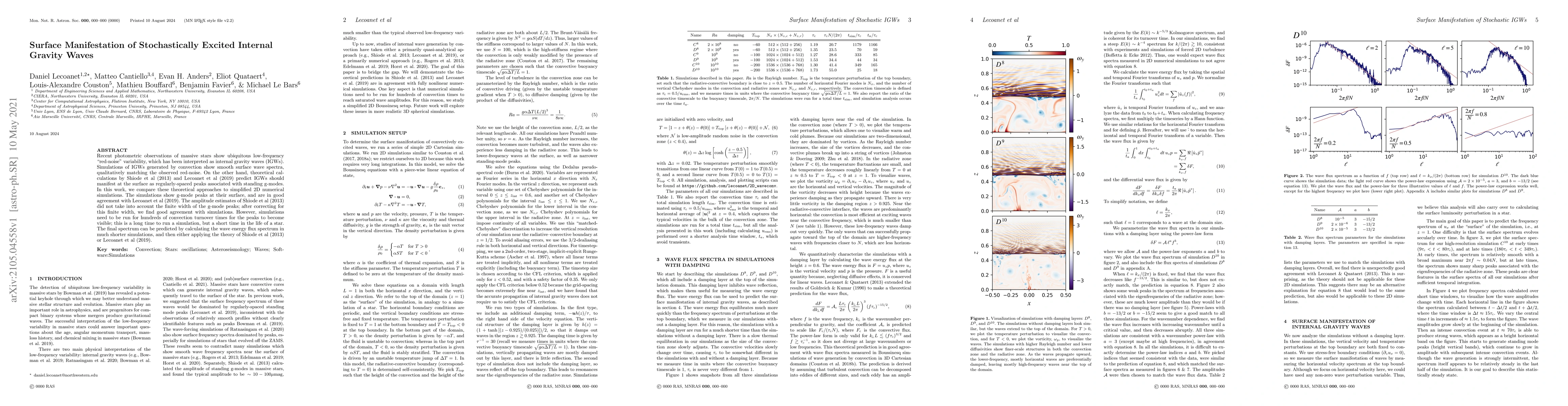 Recent photometric observations of massive stars show ubiquitous low-frequency "red-noise" variability, which has been interpreted as internal gravity waves (IGWs). Simulations of IGWs generated by convection show smooth surface wave spectra, qualitatively matching the observed red-noise. On the other hand, theoretical calculations by Shiode et al (2013) and Lecoanet et al (2019) predict IGWs should manifest at the surface as regularly-spaced peaks associated with standing g-modes. In this work, we compare these theoretical approaches to simplified 2D numerical simulations. The simulations show g-mode peaks at their surface, and are in good agreement with Lecoanet et al (2019). The amplitude estimates of Shiode et al (2013) did not take into account the finite width of the g-mode peaks; after correcting for this finite width, we find good agreement with simulations. However, simulations need to be run for hundreds of convection turnover times for the peaks to become visible; this is a long time to run a simulation, but a short time in the life of a star. The final spectrum can be predicted by calculating the wave energy flux spectrum in much shorter simulations, and then either applying the theory of Shiode et al (2013) or Lecoanet et al (2019).