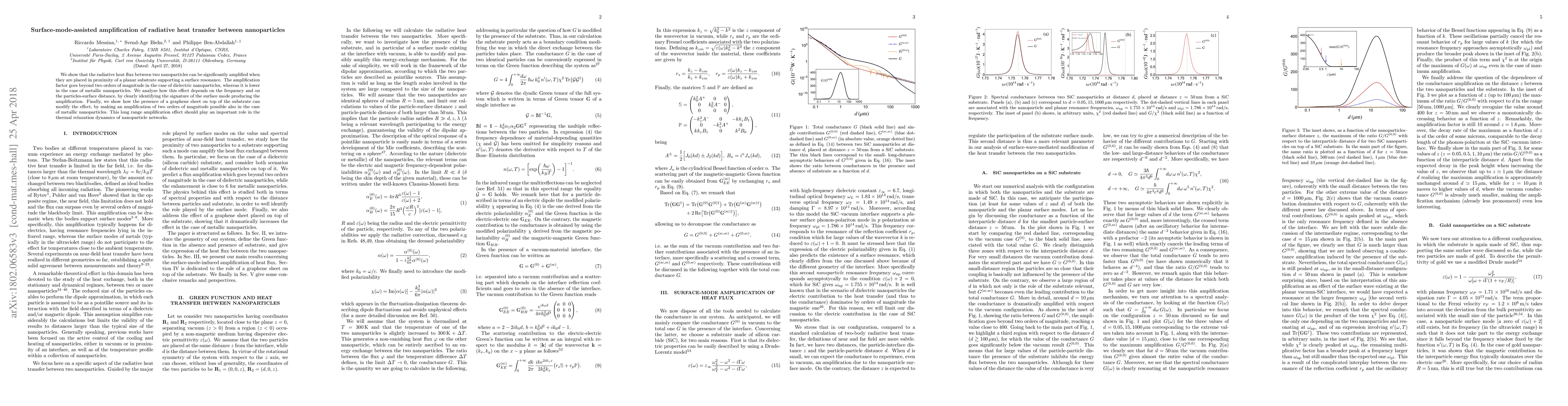 This paper demonstrates that radiative heat transfer between nanoparticles can be greatly amplified by placing them near a substrate supporting surface resonances, with dielectric nanoparticles showing a two-order-of-magnitude increase. The effect is less pronounced for metallic nanoparticles but can be enhanced by adding a graphene sheet, suggesting significant implications for thermal dynamics in nanoparticle networks.