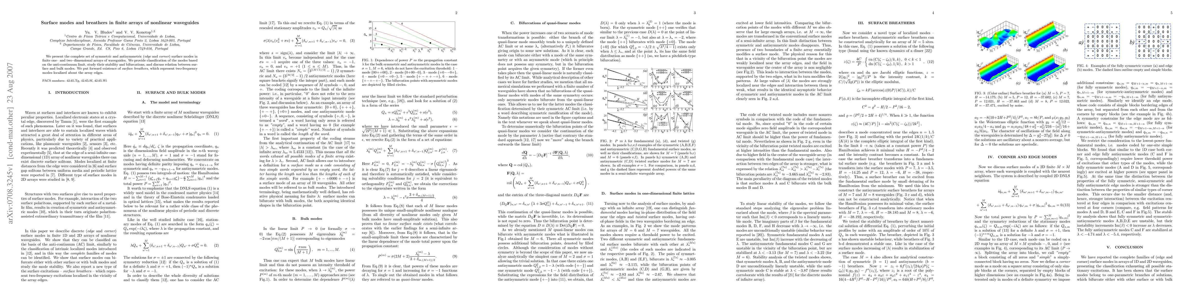 This paper classifies surface modes in finite arrays of nonlinear waveguides, identifying symmetric and antisymmetric modes, and explores their stability and bifurcations. The study also introduces the concept of surface breathers, which are two-frequency localized modes near the array edges.