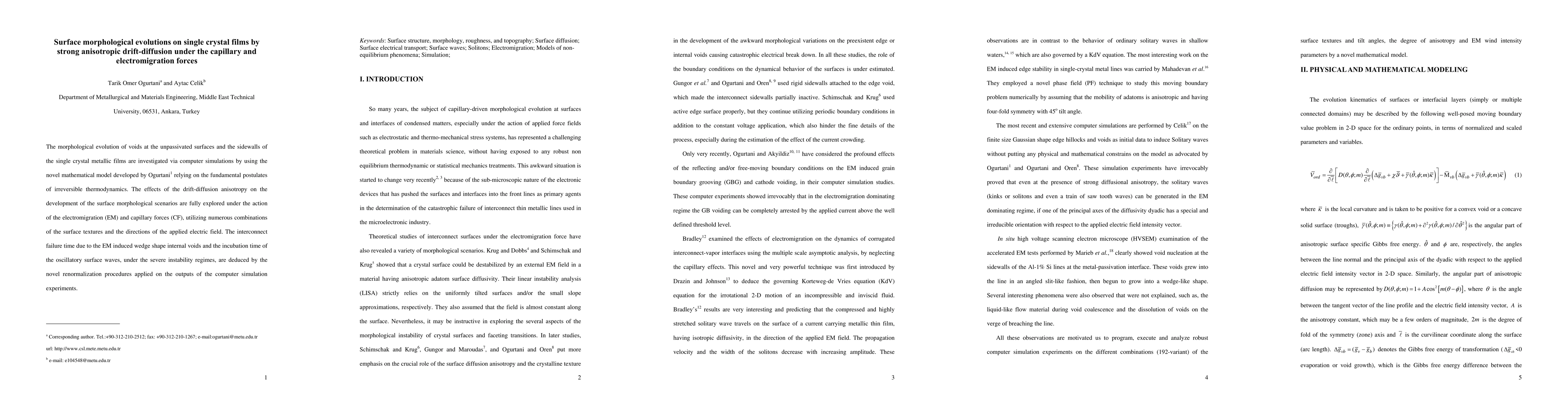 The morphological evolution of voids at the unpassivated surfaces and the sidewalls of the single crystal metallic films are investigated via computer simulations by using the novel mathematical model developed by Ogurtani relying on the fundamental postulates of irreversible thermodynamics. The effects of the drift-diffusion anisotropy on the development of the surface morphological scenarios are fully explored under the action of the electromigration (EM) and capillary forces (CF), utilizing numerous combination of the surface textures and the directions of the applied electric field. The interconnect failure time due to the EM induced wedge shape internal voids and the incubation time of the oscillatory surface waves, under the severe instability regimes, are deduced by the novel renormalization procedures applied on the outputs of the computer simulation experiments.