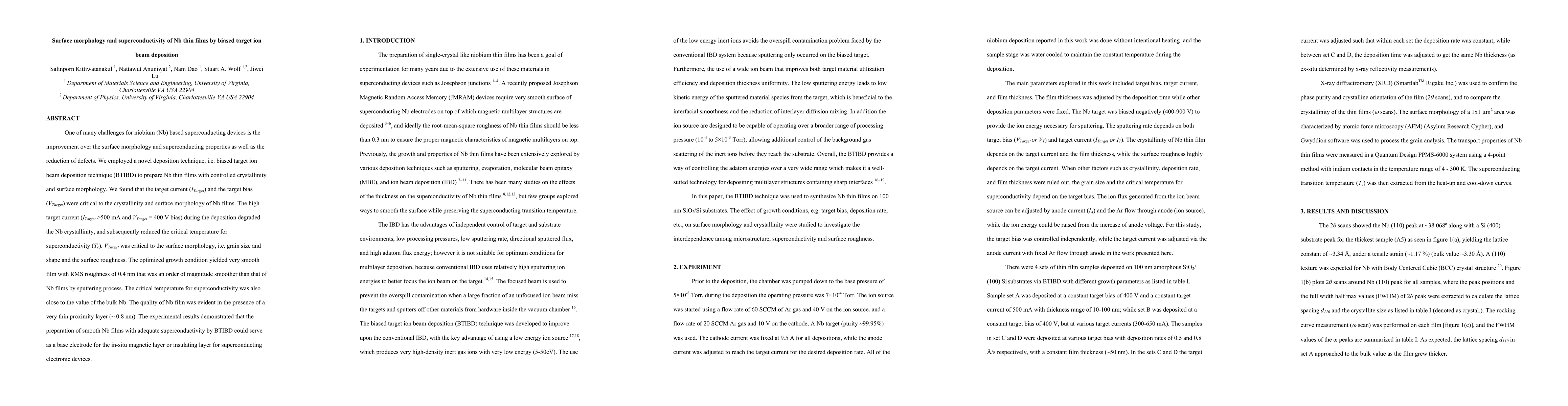 This study investigates the surface morphology and superconductivity of Nb thin films prepared using biased target ion beam deposition (BTIBD). The optimal target bias and current conditions were found to enhance film smoothness and maintain high superconducting properties, achieving a critical temperature close to bulk Nb values.