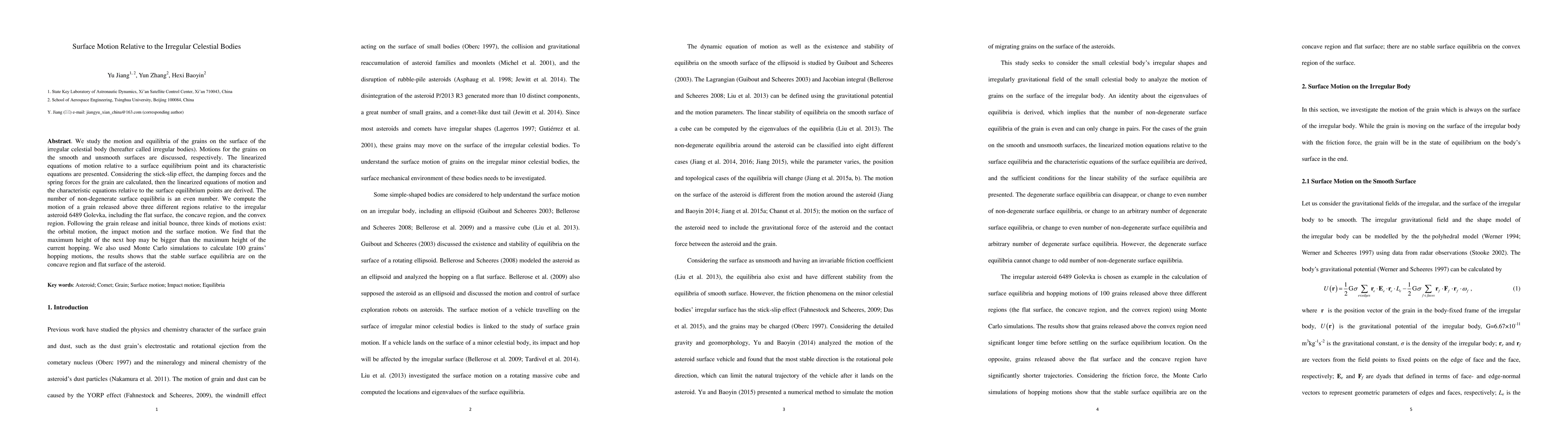 This paper investigates the motion and equilibria of grains on the surface of irregular celestial bodies, focusing on the stick-slip effect and deriving linearized equations for different surface regions. It finds that stable equilibria are more likely to occur in concave and flat regions, and that grains may achieve higher hops than initially expected.
