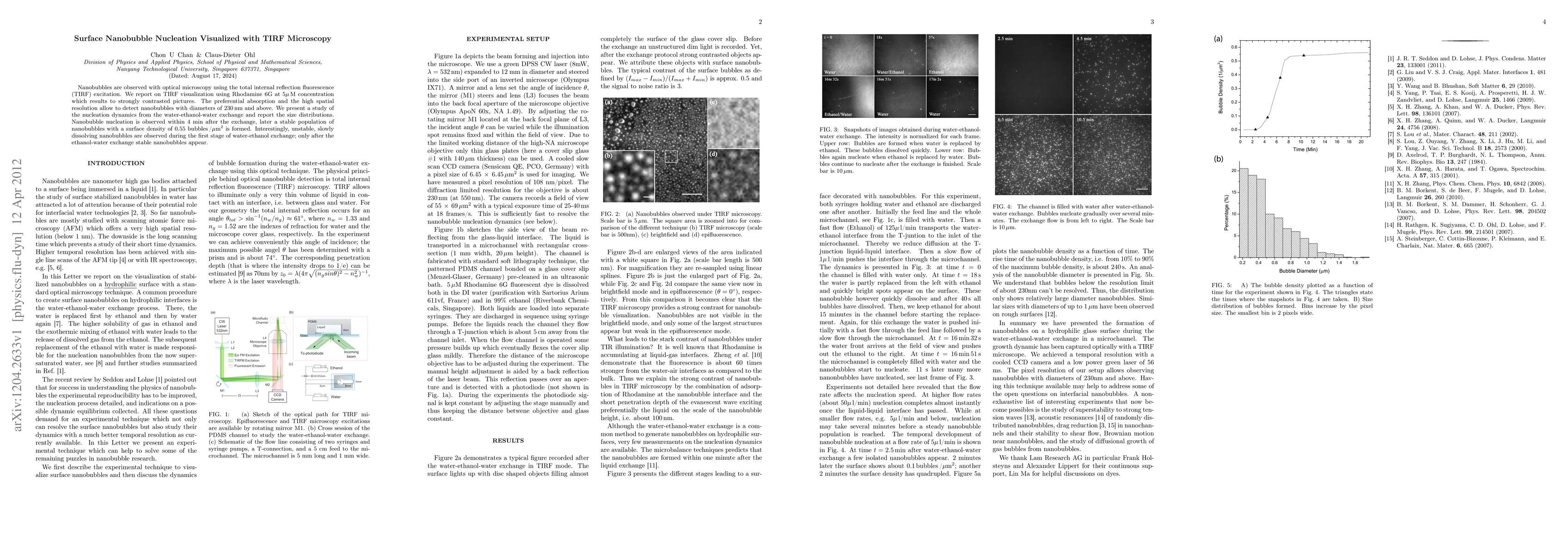 This paper utilizes TIRF microscopy to visualize and study the nucleation dynamics of nanobubbles, achieving high spatial resolution and detecting bubbles as small as 230 nm. The study reveals that stable nanobubbles form within 4 minutes after water-ethanol exchange, with a final surface density of 0.55 bubbles/µm², while initially unstable nanobubbles dissolve before stable ones appear.