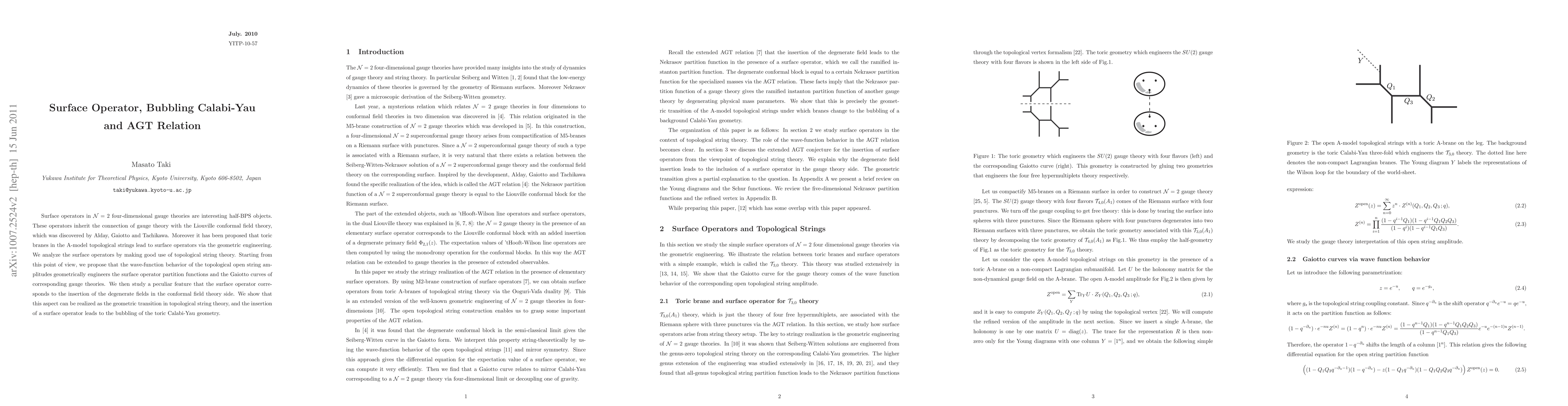 The paper explores surface operators in N=2 four-dimensional gauge theories, linking them to Liouville CFT and topological string theory. It proposes that surface operator partition functions and gauge theory Gaiotto curves are engineered by topological open string amplitude wave-functions, and that surface operator insertion corresponds to toric Calabi-Yau bubbling via geometric transition.