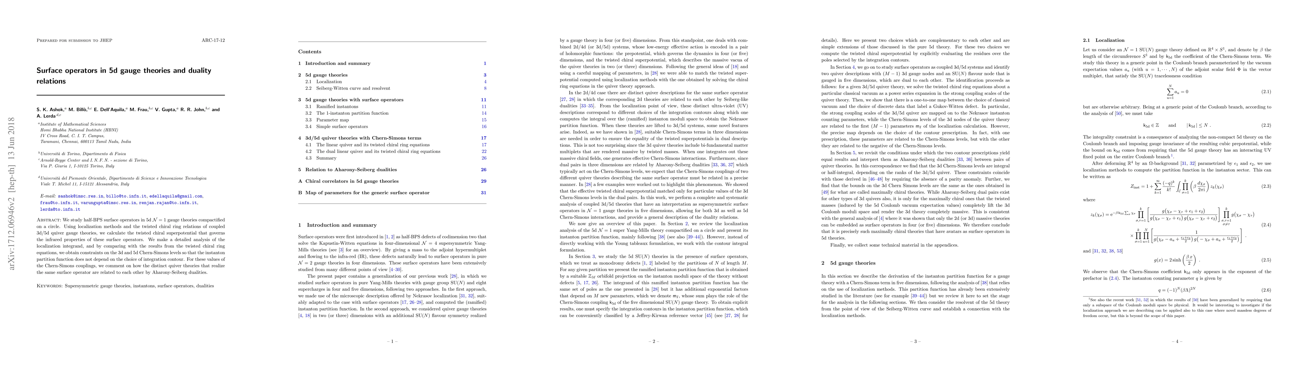 This paper investigates half-BPS surface operators in 5d N=1 gauge theories via localization techniques and twisted chiral ring relations, revealing constraints on Chern-Simons levels and exploring dualities through Aharony-Seiberg transformations.