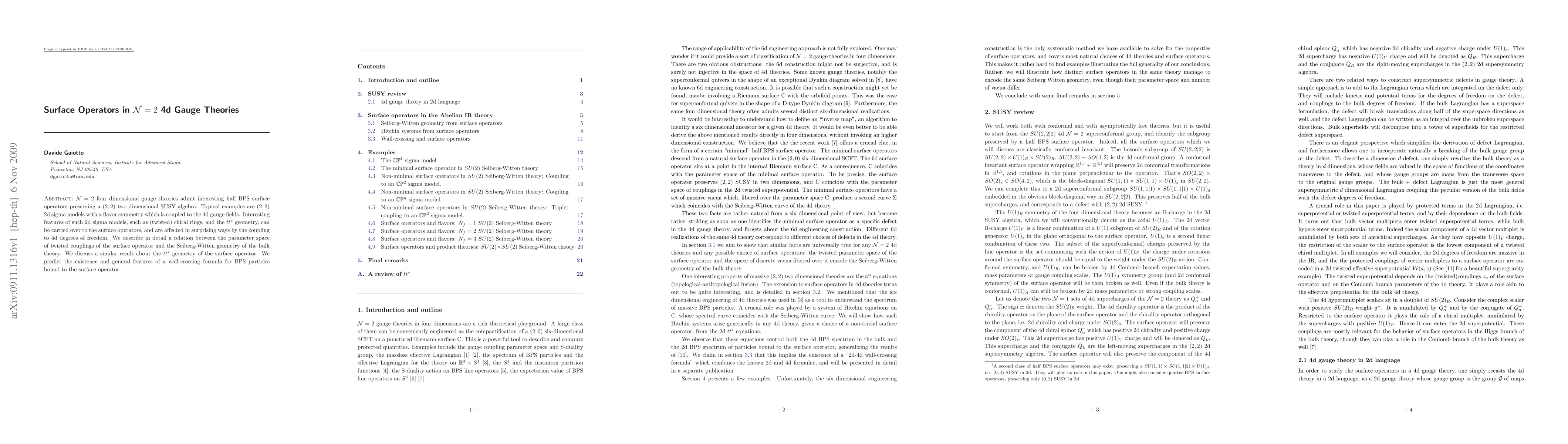 N=2 four dimensional gauge theories admit interesting half BPS surface operators preserving a (2,2) two dimensional SUSY algebra. Typical examples are (2,2) 2d sigma models with a flavor symmetry which is coupled to the 4d gauge fields. Interesting features of such 2d sigma models, such as (twisted) chiral rings, and the tt* geometry, can be carried over to the surface operators, and are affected in surprising ways by the coupling to 4d degrees of freedom. We will describe in detail a relation between the parameter space of twisted couplings of the surface operator and the Seiberg-Witten geometry of the bulk theory. We will discuss a similar result about the tt* geometry of the surface operator. We will predict the existence and general features of a wall-crossing formula for BPS particles bound to the surface operator.