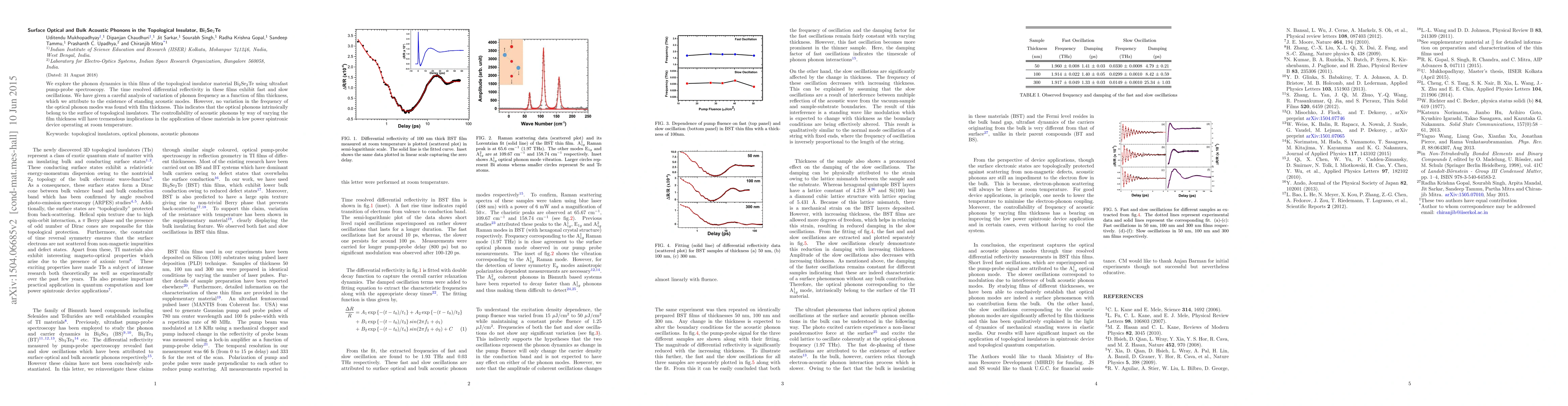 We explore the phonon dynamics of thin films of the topological insulator material Bi2Se2Te using ultrafast pump-probe spectroscopy. The time resolved differential reflectivity of the films exhibit fast and slow oscillations. We have given a careful analysis of variation of phonon frequency as a function of film thickness attributing this to existence of standing acoustic modes. However, no variation in the frequency of the optical phonon modes was found with film thickness. This indicates that the optical phonons intrinsically belong to the surface of the topological insulators. The fact that the acoustic phonons can be tuned by changing the film thickness has tremendous potential for room temperature low power spintronic devices and in topological quantum computation.