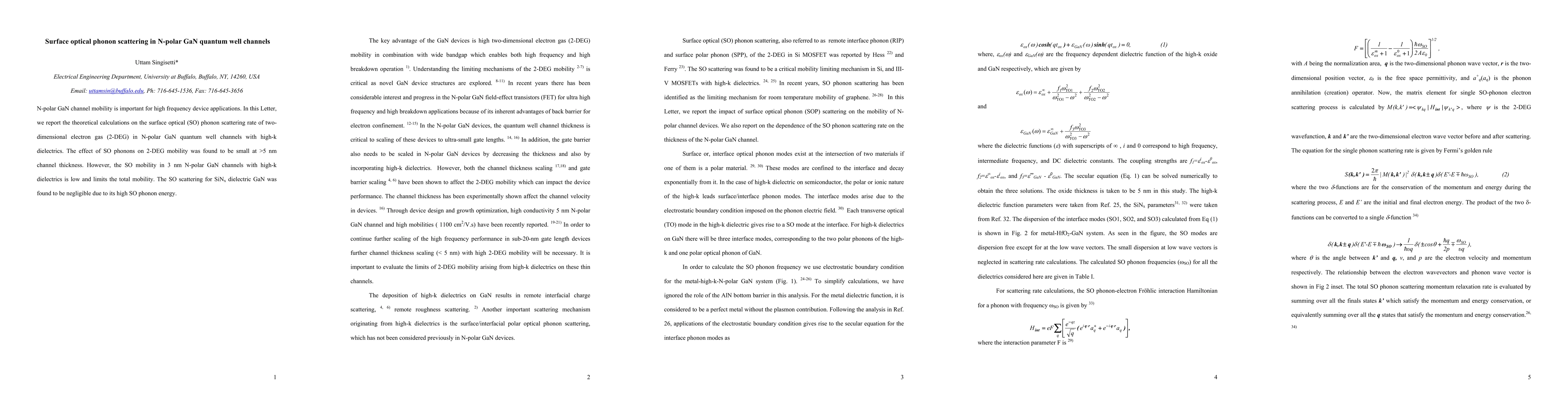 This paper investigates the impact of surface optical phonon scattering on electron mobility in N-polar GaN quantum well channels, finding minimal effect for channels over 5 nm thick, but significant limitations in mobility for 3 nm channels due to surface optical phonon scattering, with SiNx dielectrics showing negligible scattering.