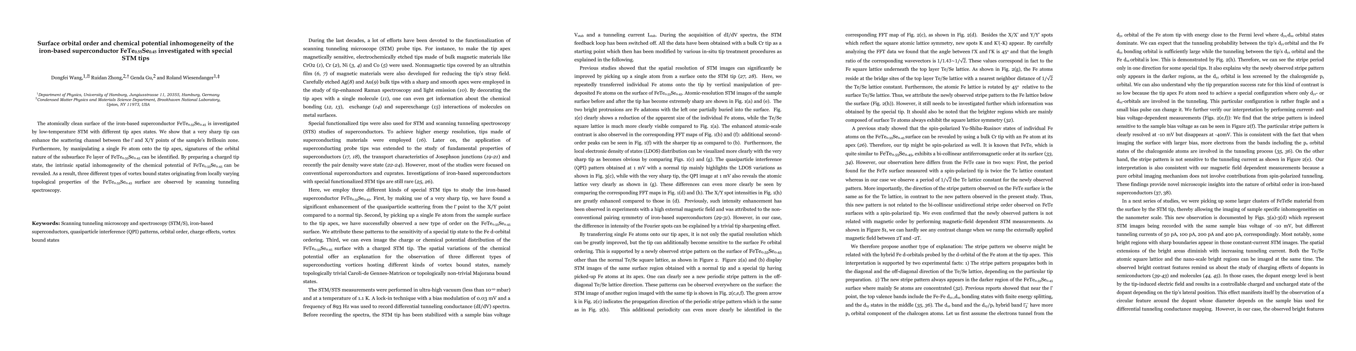 This study uses low-temperature STM with specially prepared tips to investigate the surface orbital order and chemical potential inhomogeneity in FeTe0.55Se0.45, revealing three types of vortex bound states due to locally varying topological properties. The research highlights the influence of tip apex states on probing subsurface Fe layers and the intrinsic spatial inhomogeneity of the chemical potential.