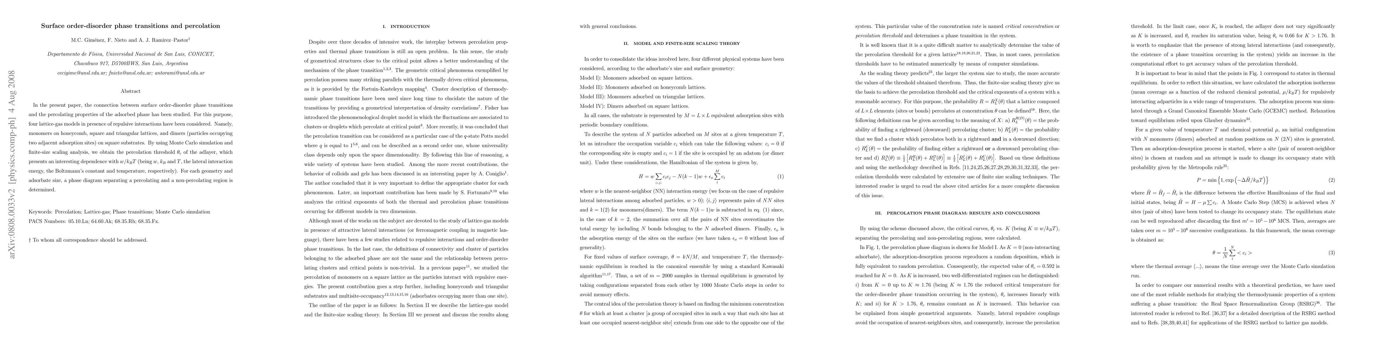 In the present paper, the connection between surface order-disorder phase transitions and the percolating properties of the adsorbed phase has been studied. For this purpose, four lattice-gas models in presence of repulsive interactions have been considered. Namely, monomers on honeycomb, square and triangular lattices, and dimers (particles occupying two adjacent adsorption sites) on square substrates. By using Monte Carlo simulation and finite-size scaling analysis, we obtain the percolation threshold $\theta_c$ of the adlayer, which presents an interesting dependence with $w/k_BT$ (being $w$, $k_B$ and $T$, the lateral interaction energy, the Boltzmann's constant and temperature, respectively). For each geometry and adsorbate size, a phase diagram separating a percolating and a non-percolating region is determined.