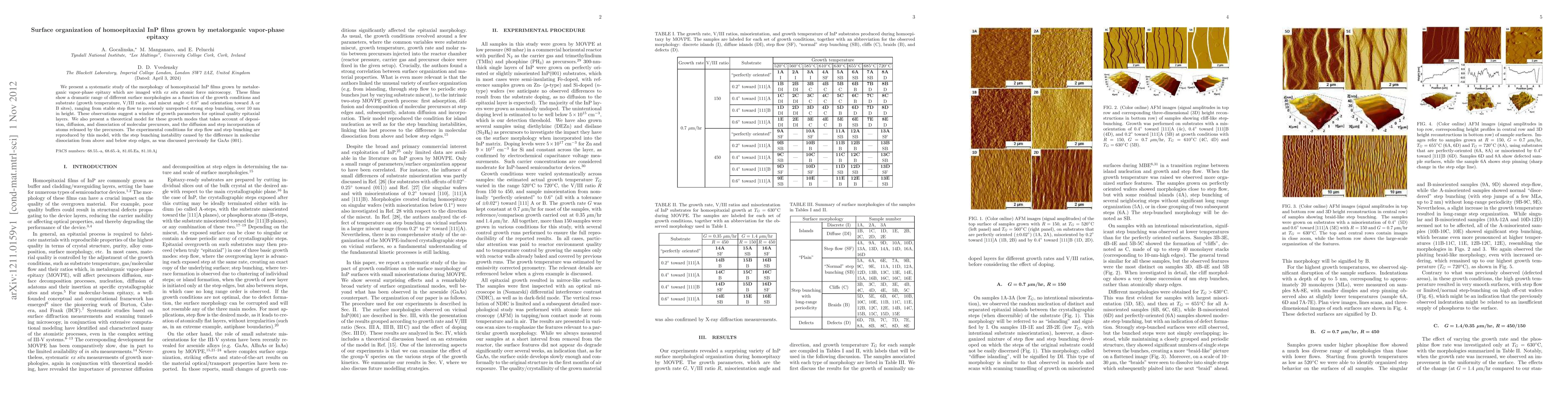 This study investigates the surface morphology of homoepitaxial InP films grown via metalorganic vapor-phase epitaxy, revealing varied structures dependent on growth conditions, and identifies optimal parameters for high-quality epitaxy. A theoretical model explains the growth modes, including step flow and step bunching, based on precursor dissociation and atomic diffusion.