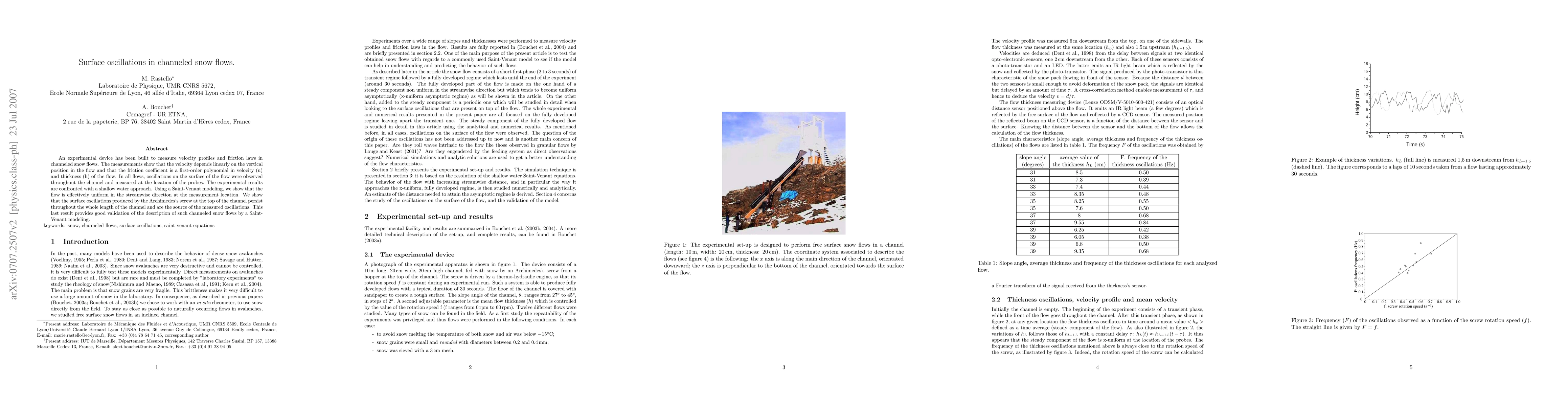 This paper investigates surface oscillations in channeled snow flows using an experimental setup to measure velocity profiles and friction laws. The study finds that surface oscillations originate from the Archimedes's screw at the channel's top and persist throughout the channel, validated by a Saint-Venant modeling approach.