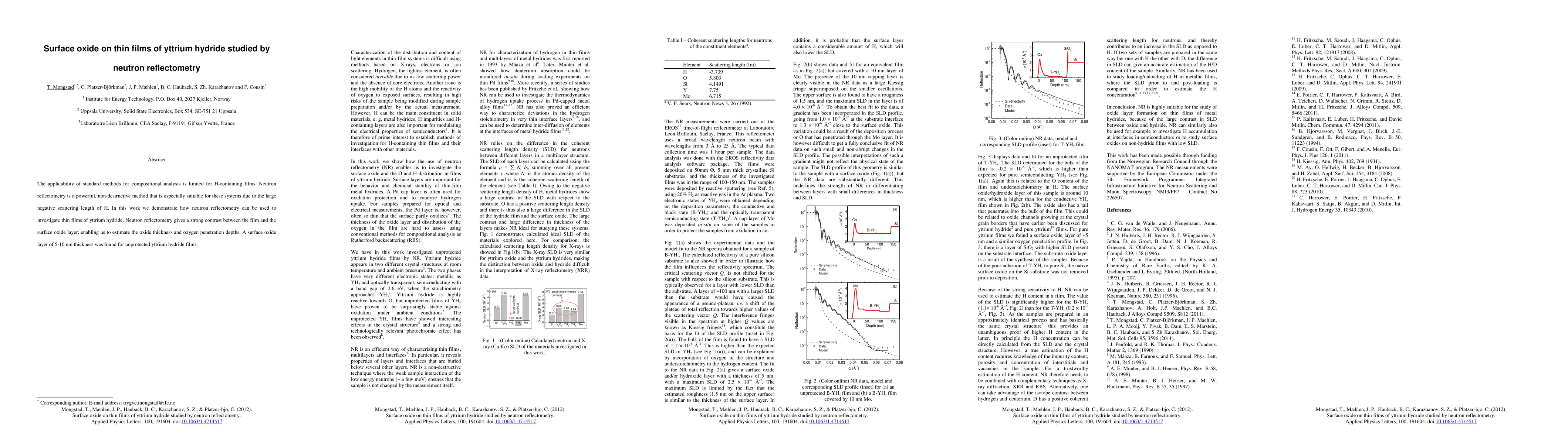 This study uses neutron reflectometry to analyze thin films of yttrium hydride, revealing a surface oxide layer of 5-10 nm thickness. The technique provides a non-destructive method to estimate oxide thickness and oxygen penetration depths, overcoming limitations of standard compositional analysis.