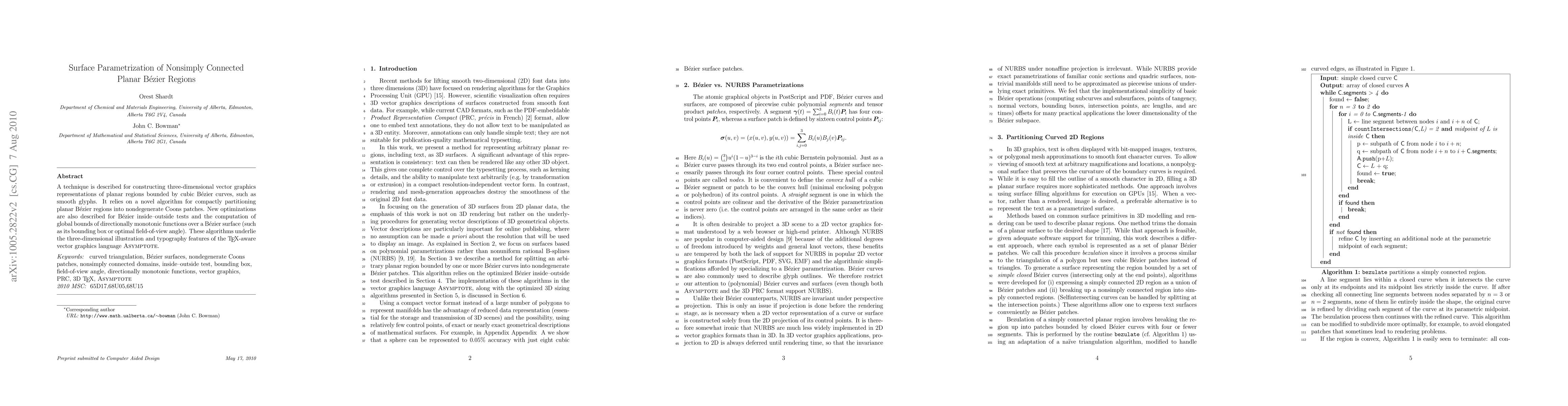 A technique is described for constructing three-dimensional vector graphics representations of planar regions bounded by cubic B\'ezier curves, such as smooth glyphs. It relies on a novel algorithm for compactly partitioning planar B\'ezier regions into nondegenerate Coons patches. New optimizations are also described for B\'ezier inside-outside tests and the computation of global bounds of directionally monotonic functions over a B\'ezier surface (such as its bounding box or optimal field-of-view angle). These algorithms underlie the three-dimensional illustration and typography features of the TeX-aware vector graphics language Asymptote.
