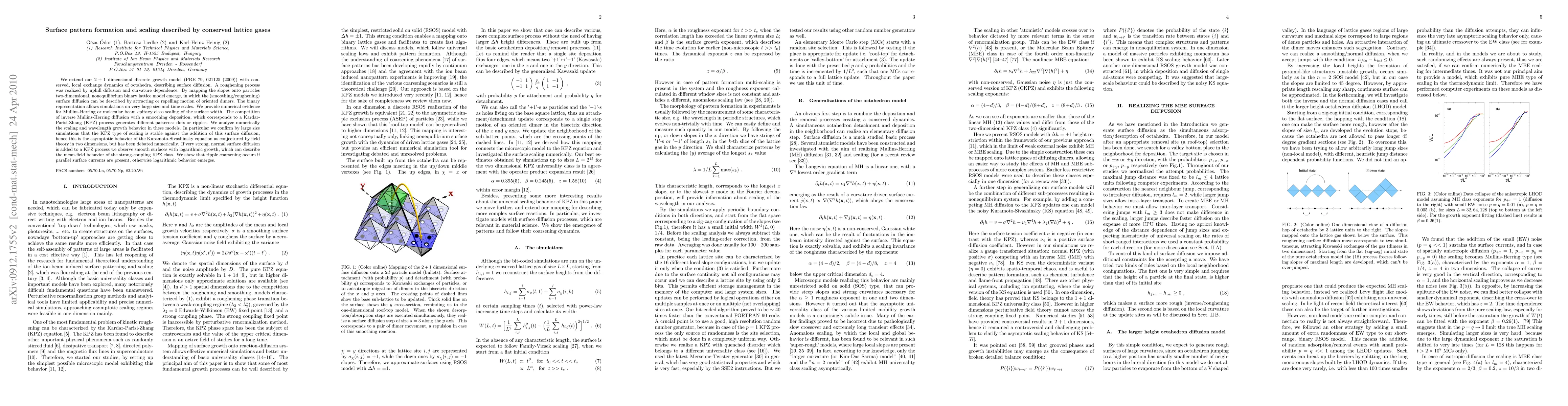 We extend our 2+1 dimensional discrete growth model (PRE 79, 021125 (2009)) with conserved, local exchange dynamics of octahedra, describing surface diffusion. A roughening process was realized by uphill diffusion and curvature dependence. By mapping the slopes onto particles two-dimensional, nonequilibrium binary lattice model emerge, in which the (smoothing/roughening) surface diffusion can be described by attracting or repelling motion of oriented dimers. The binary representation allows simulations on very large size and time scales. We provide numerical evidence for Mullins-Herring or molecular beam epitaxy class scaling of the surface width. The competition of inverse Mullins-Herring diffusion with a smoothing deposition, which corresponds to a Kardar-Parisi-Zhang (KPZ) process generates different patterns: dots or ripples. We analyze numerically the scaling and wavelength growth behavior in these models. In particular we confirm by large size simulations that the KPZ type of scaling is stable against the addition of this surface diffusion, hence this is the asymptotic behavior of the Kuramoto-Sivashinsky equation as conjectured by field theory in two dimensions, but has been debated numerically. If very strong, normal surface diffusion is added to a KPZ process we observe smooth surfaces with logarithmic growth, which can describe the mean-field behavior of the strong-coupling KPZ class. We show that ripple coarsening occurs if parallel surface currents are present, otherwise logarithmic behavior emerges.