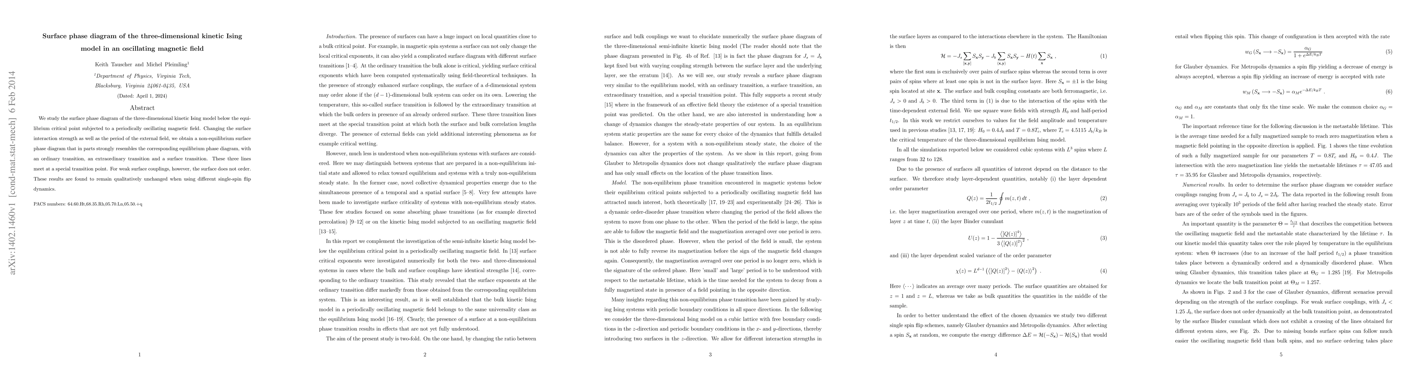 This paper investigates the surface phase diagram of a three-dimensional kinetic Ising model under a periodically oscillating magnetic field, revealing transitions similar to equilibrium conditions but influenced by surface interaction strength and field period. The study finds that weak surface couplings prevent surface ordering, with results consistent across different single-spin flip dynamics.