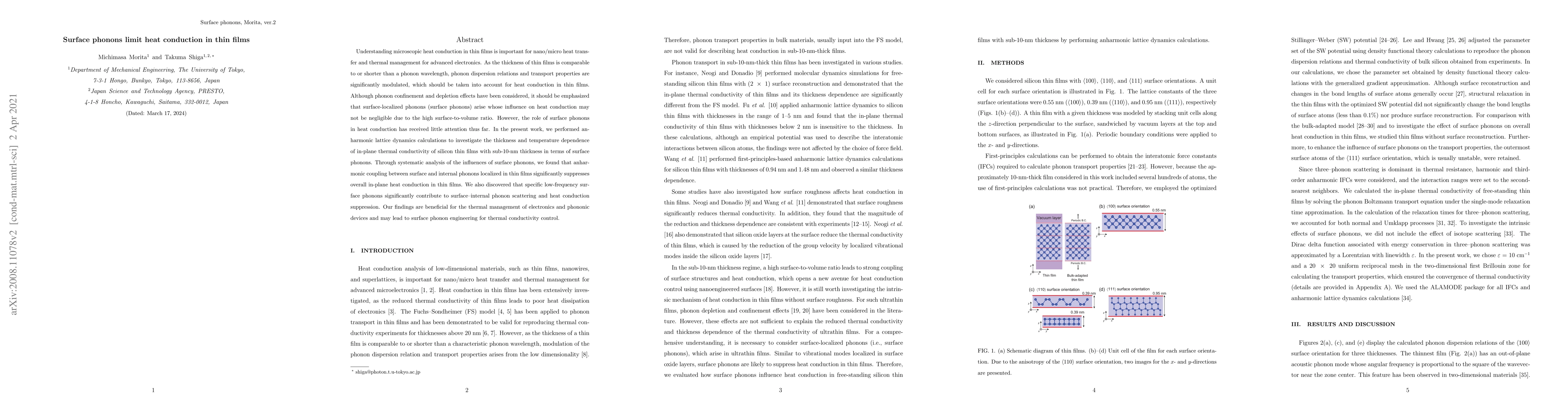 This paper investigates how surface phonons affect heat conduction in thin silicon films, finding that anharmonic coupling between surface and internal phonons significantly reduces overall in-plane thermal conductivity, with specific low-frequency surface phonons contributing to this suppression. The study highlights the importance of considering surface phonons for thermal management in advanced electronics.