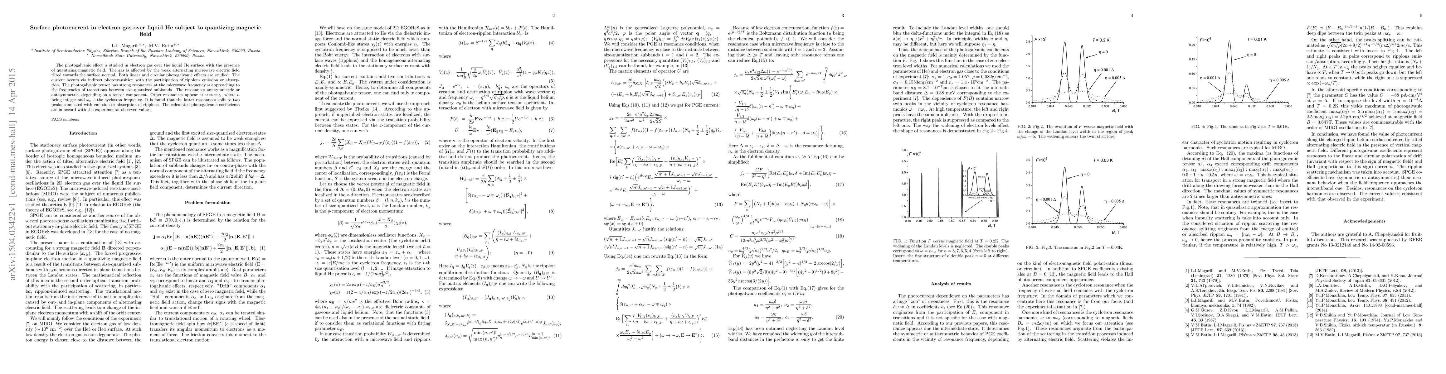 The photogalvanic effect is studied in electron gas over the liquid He surface with the presence of quantizing magnetic field. The gas is affected by the weak alternating microwave electric field tilted towards the surface normal. Both linear and circular photogalvanic effects are studied. The current occurs via indirect phototransition with the participation of ripplons emission or absorption. The photogalvanic tensor has strong resonances at the microwave frequency $\omega$ approaching to the frequencies of transitions between size-quantized subbands. The resonances are symmetric or antisymmetric, depending on a tensor component. Other resonances appear at $\omega\approx n \omega_c$, where $n$ being integer and $\omega_c$ is the cyclotron frequency. It is found that the latter resonances split to two peaks connected with emission or absorption of ripplons. The calculated photogalvanic coefficients are in accord with the experimental observed values.