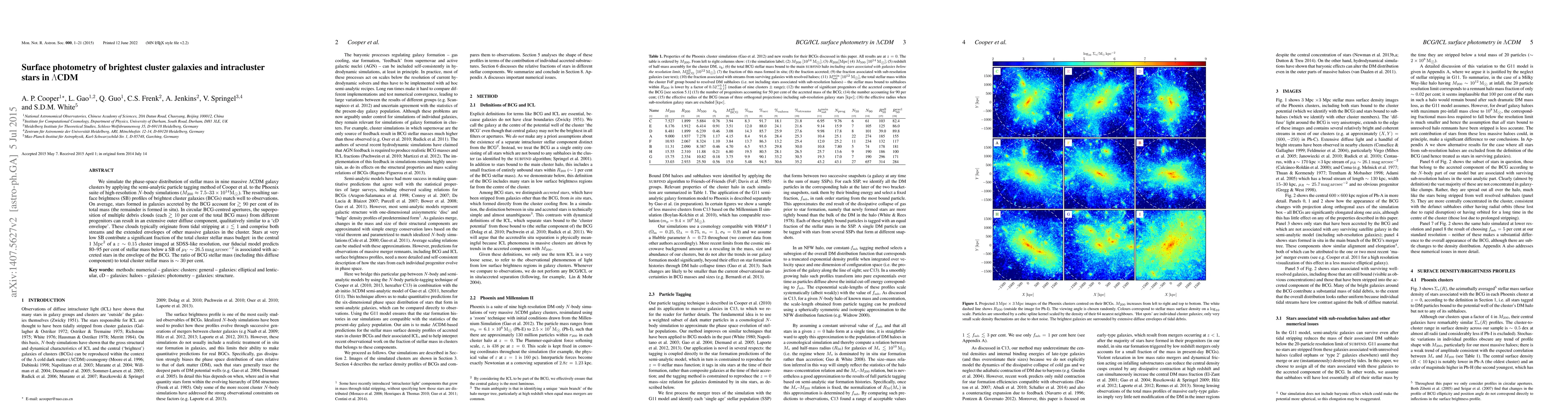 We simulate the phase-space distribution of stellar mass in 9 massive Lambda-CDM galaxy clusters by applying the semi-analytic particle tagging method of Cooper et al. to the Phoenix suite of high-resolution N-body simulations (M200 = 7.5 to 33 x 10^14 Msol). The resulting surface brightness (SB) profiles of brightest cluster galaxies (BCGs) match well to observations. On average, stars formed in galaxies accreted by the BCG account for ~90 per cent of its total mass (the remainder is formed in situ). In circular BCG-centred apertures, the superposition of multiple debris clouds (each ~10 per cent of the total BCG mass) from different progenitors can result in an extensive outer diffuse component, qualitatively similar to a 'cD envelope'. These clouds typically originate from tidal stripping at z < 1 and comprise both streams and the extended envelopes of other massive galaxies in the cluster. Stars at very low SB contribute a significant fraction of the total cluster stellar mass budget: in the central 1 Mpc^2 of a z ~ 0.15 cluster imaged at SDSS-like resolution, our fiducial model predicts 80-95 per cent of stellar mass below a SB of mu_V = 26.5 mag arcsec^2 is associated with accreted stars in the envelope of the BCG. The ratio of BCG stellar mass (including this diffuse component) to total cluster stellar mass is ~30 per cent.