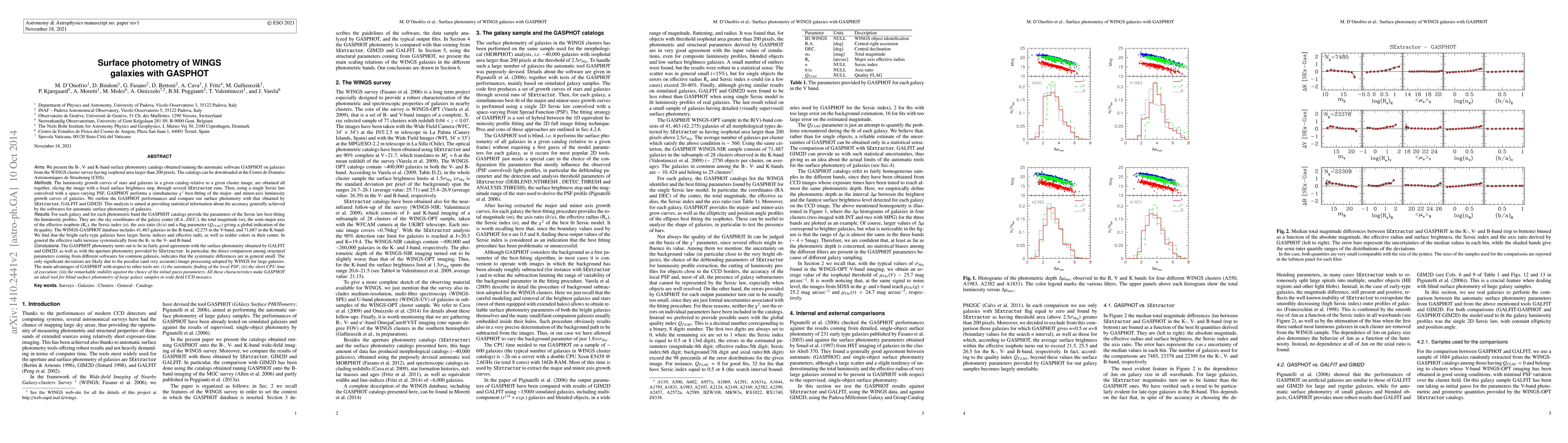 This paper presents B-, V-, and K-band surface photometry catalogs of WINGS galaxies using the GASPHOT software, comparing its performance with other tools. GASPHOT provides parameters like Sersic indices and effective radii, showing good agreement with other methods and highlighting its efficiency and stability for large-scale galaxy studies.