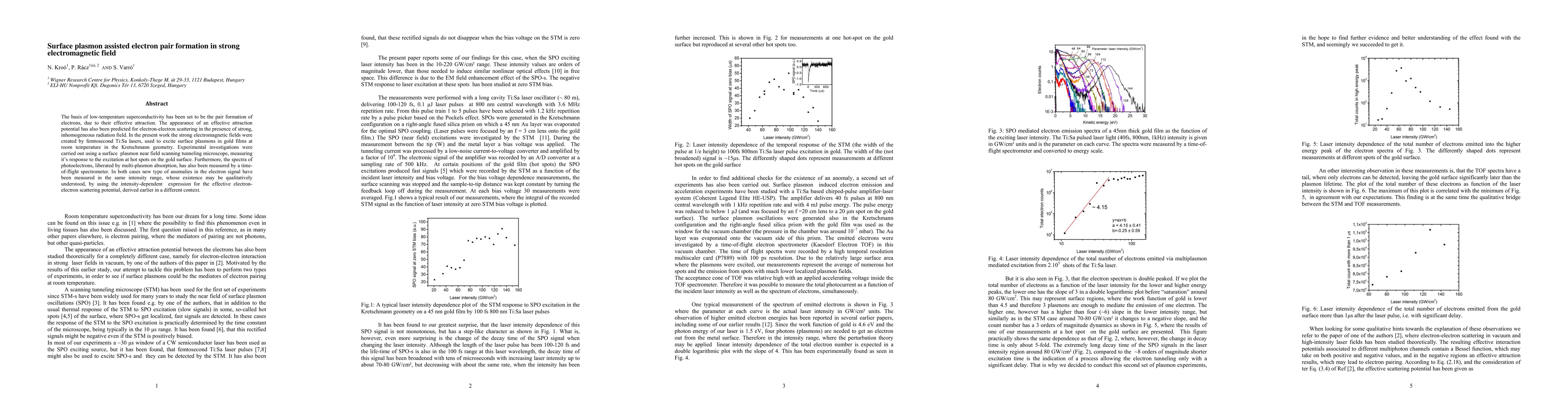 This paper investigates electron pair formation in strong electromagnetic fields created by femtosecond Ti:Sa lasers exciting surface plasmons in gold films. Experimental results using a surface plasmon near-field scanning tunneling microscope and a time-of-flight spectrometer reveal anomalies in the photoelectron spectra, suggesting a new type of electron-electron interaction potential in the presence of intense radiation fields.