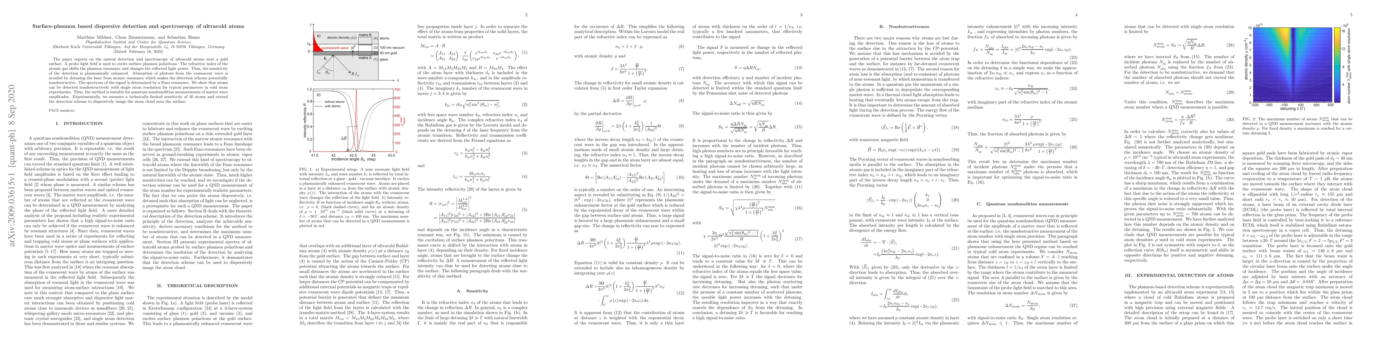 This paper presents a method for nondestructive optical detection and spectroscopy of ultracold atoms using surface plasmon polaritons excited by a probe light field. The method leverages plasmonic enhancement and avoids photon absorption through laser detuning, achieving single atom resolution and demonstrating potential for quantum nondemolition measurements. Experimentally, it achieves a sensitivity of 30 atoms and enables dispersive imaging of atom clouds.