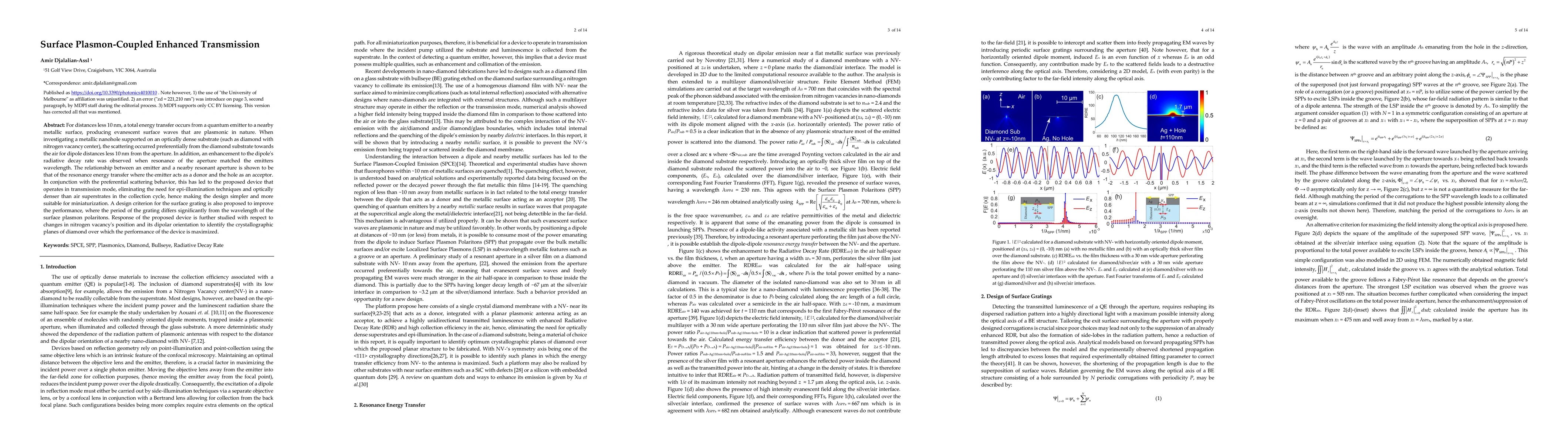 For distances less 10 nm, a total energy transfer occurs from a quantum emitter to a nearby metallic surface, producing evanescent surface waves that are plasmonic in nature. When investigating a metallic nanohole supported on an optically dense substrate (such as diamond with nitrogen vacancy center), the scattering occurred preferentially from the diamond substrate towards the air for dipole distances less 10 nm from the aperture. In addition, an enhancement to the dipole's radiative decay rate was observed when resonance of the aperture matched the emitters wavelength. The relationship between an emitter and a nearby resonant aperture is shown to be that of the resonance energy transfer where the emitter acts as a donor and the hole as an acceptor. In conjunction with the preferential scattering behavior, this has led to the proposed device that operates in transmission mode, eliminating the need for epi-illumination techniques and optically denser than air superstrates in the collection cycle, hence making the design simpler and more suitable for miniaturization. A design criterion for the surface grating is also proposed to improve the performance, where the period of the grating differs significantly from the wavelength of the surface plasmon polaritons. Response of the proposed device is further studied with respect to changes in nitrogen vacancy's position and its dipolar orientation to identify the crystallographic planes of diamond over which the performance of the device is maximized.