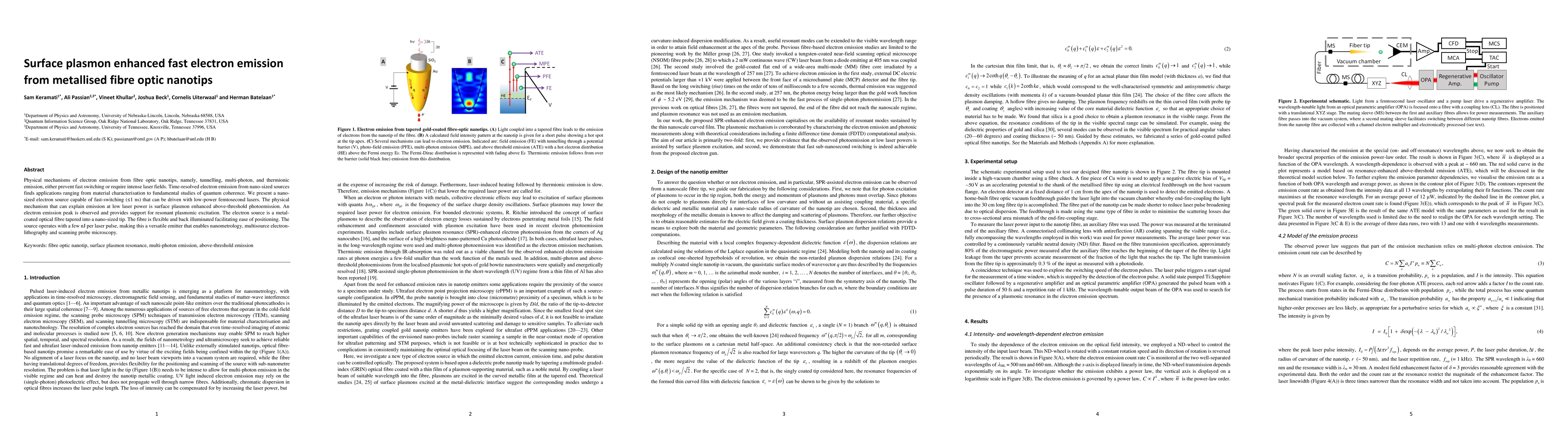 Physical mechanisms of electron emission from fibre optic nanotips, namely, tunnelling, multi-photon, and thermionic emission, either prevent fast switching or require intense laser fields. Time-resolved electron emission from nano-sized sources finds applications ranging from material characterisation to fundamental studies of quantum coherence. We present a nano-sized electron source capable of fast-switching (<1 ns) that can be driven with low-power femtosecond lasers. The physical mechanism that can explain emission at low laser power is surface plasmon enhanced above-threshold photoemission. An electron emission peak is observed and provides support for resonant plasmonic excitation. The electron source is a metal-coated optical fibre tapered into a nano-sized tip. The fibre is flexible and back illuminated facilitating ease of positioning. The source operates with a few nJ per laser pulse, making this a versatile emitter that enables nanometrology, multisource electron-lithography and scanning probe microscopy. Keywords: fibre optic nanotip, surface plasmon resonance, multi-photon emission, above-threshold emission