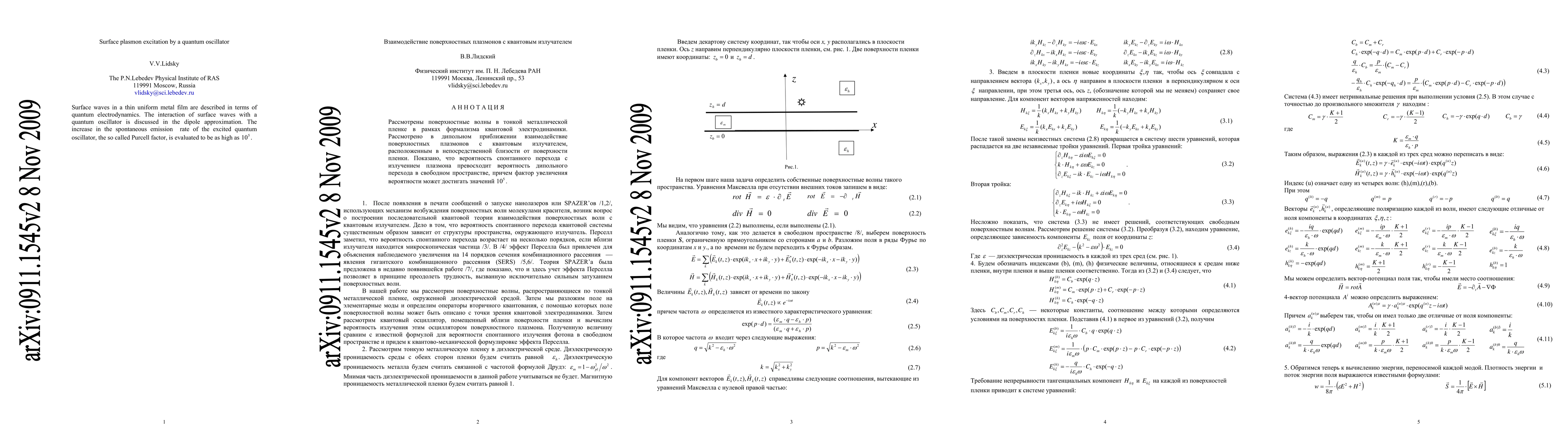 Researchers studied how a quantum oscillator interacts with surface waves in metal films, finding that it increases the oscillator's spontaneous emission rate up to 10^5 times.