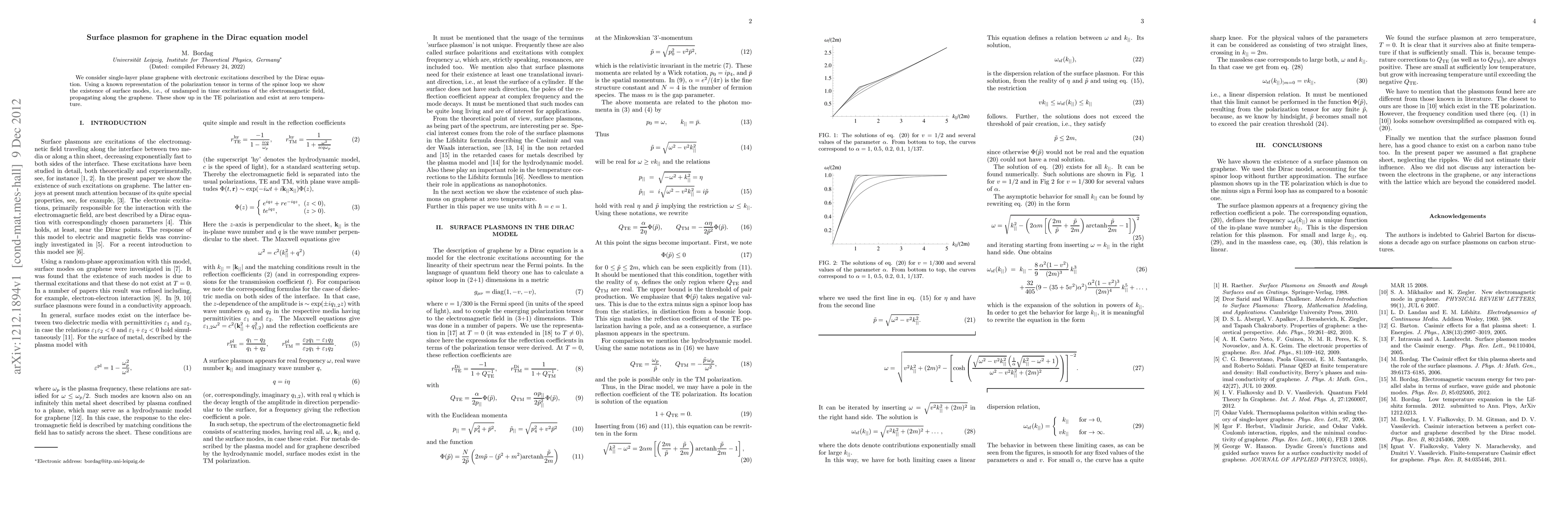 Graphene exhibits surface plasmons at zero temperature, which are undamped oscillations of the electric field that propagate along the graphene surface in the TE polarization.