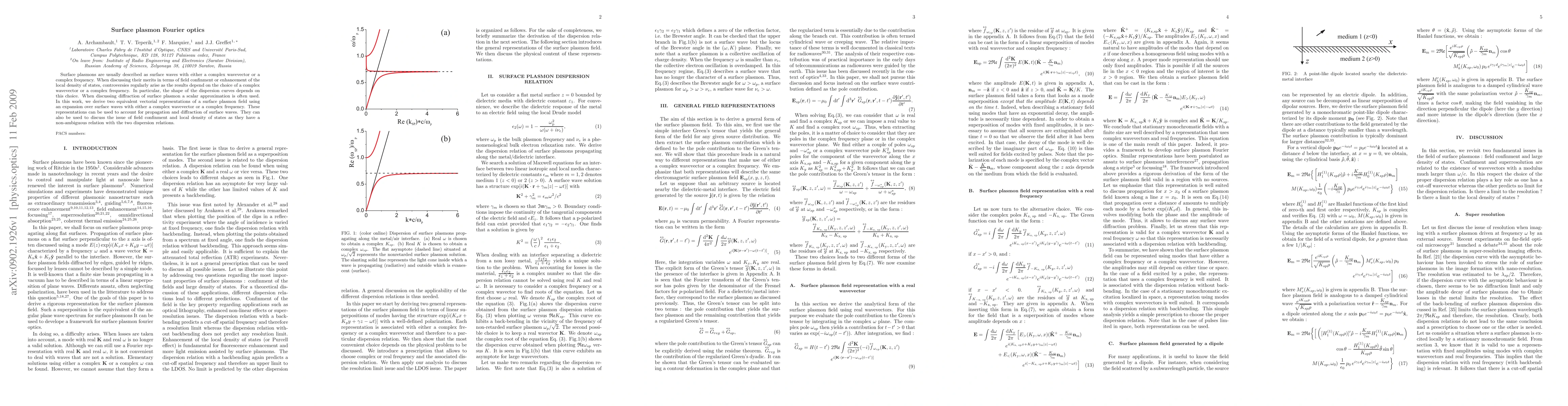 Surface plasmons are usually described as surface waves with either a complex wavevector or a complex frequency. When discussing their merits in terms of field confinment or enhancement of the local density of states, controversies regularly arise as the results depend on the choice of a complex wavevector or a complex frequency. In particular, the shape of the dispersion curves depends on this choice. When discussing diffraction of surface plasmon a scalar approximation is often used. In this work, we derive two equivalent vectorial representations of a surface plasmon field using an expansion over surface waves with either a complex wavevector or a complex frequency. These representations can be used to account for propagation and diffraction of surface waves. They can also be used to discuss the issue of field confinment and local density of states as they have a non-ambiguous relation with the two dispersion relations.