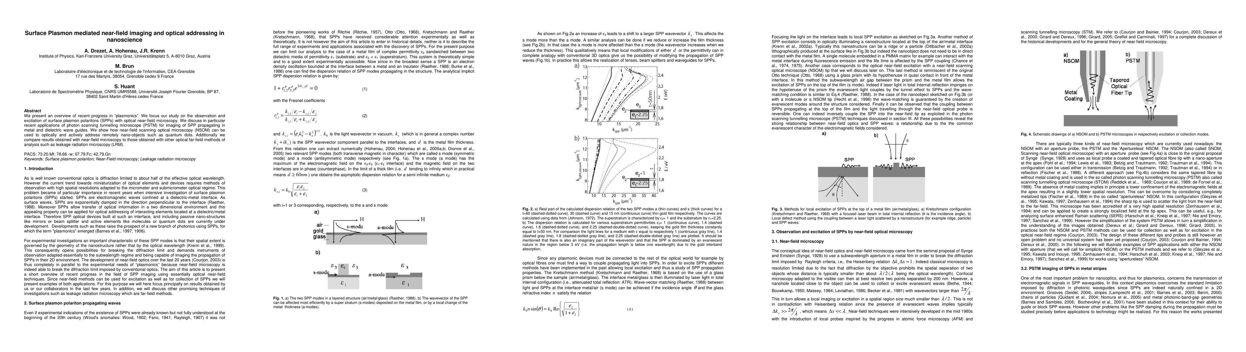 We present an overview of recent progress in plasmonics. We focus our study on the observation and excitation of surface plasmon polaritons (SPPs) with optical near-field microscopy. We discuss in particular recent applications of photon scanning tunnelling microscope (PSTM) for imaging of SPP propagating in metal and dielectric wave guides. We show how near-field scanning optical microscopy (NSOM) can be used to optically and actively address remotely nano-objects such as quantum dots. Additionally we compare results obtained with near-field microscopy to those obtained with other optical far-field methods of analysis such as leakage radiation microscopy (LRM).