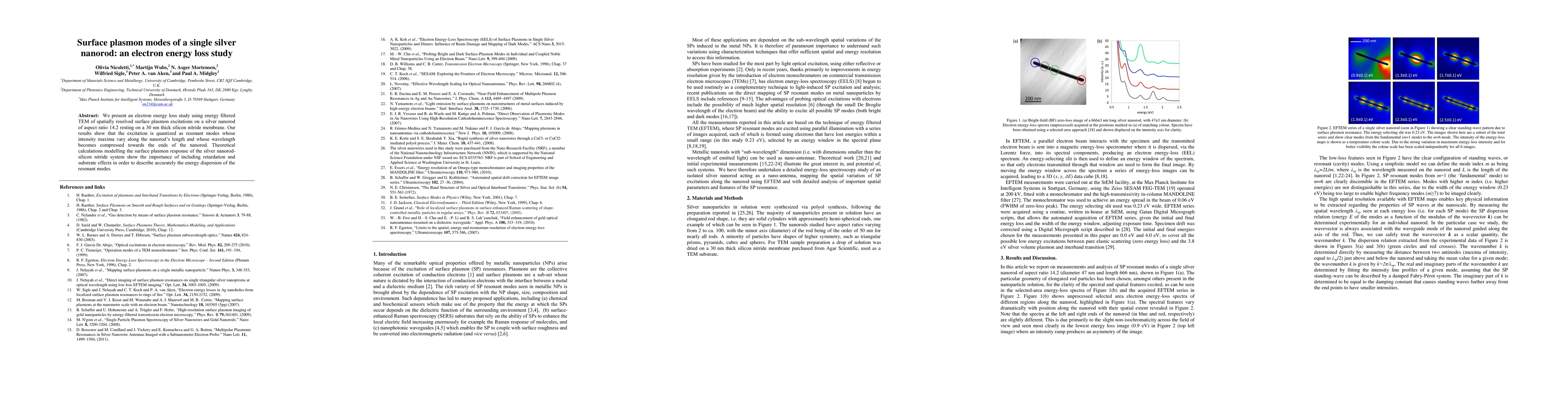 This study uses electron energy loss spectroscopy to investigate surface plasmon modes in a silver nanorod, revealing quantized resonant modes with intensity maxima along its length and compressed wavelengths at the ends. Theoretical models emphasize the necessity of considering retardation and substrate effects for accurate energy dispersion descriptions.