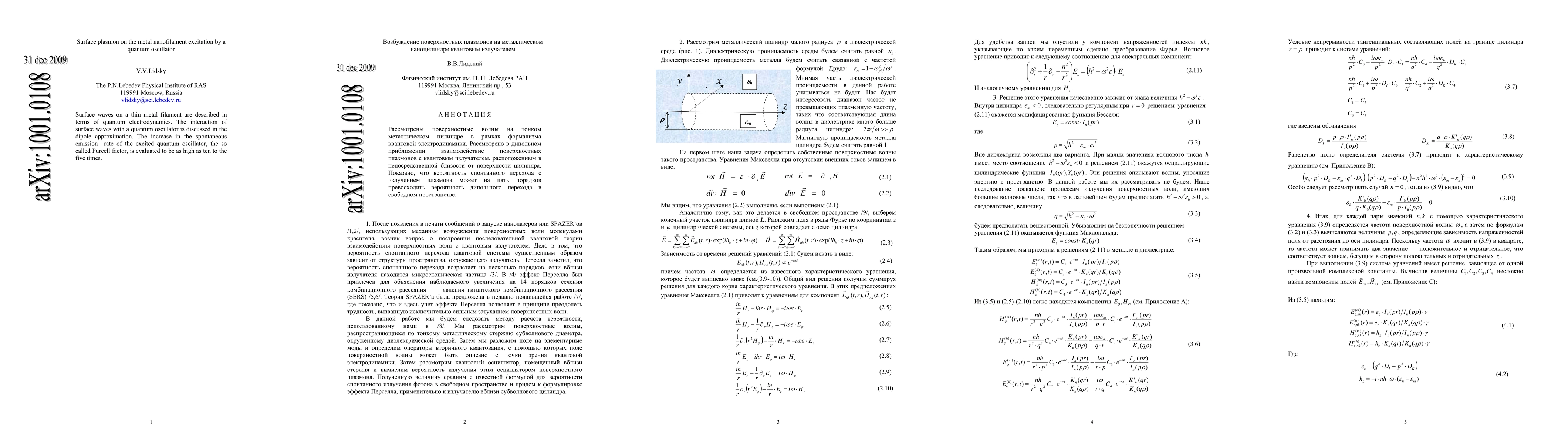 Researchers used quantum electrodynamics to study surface waves on a metal nanofilament and found that it can significantly increase the rate of spontaneous emission from a nearby oscillator, known as the Purcell factor, by up to 10^5 times.