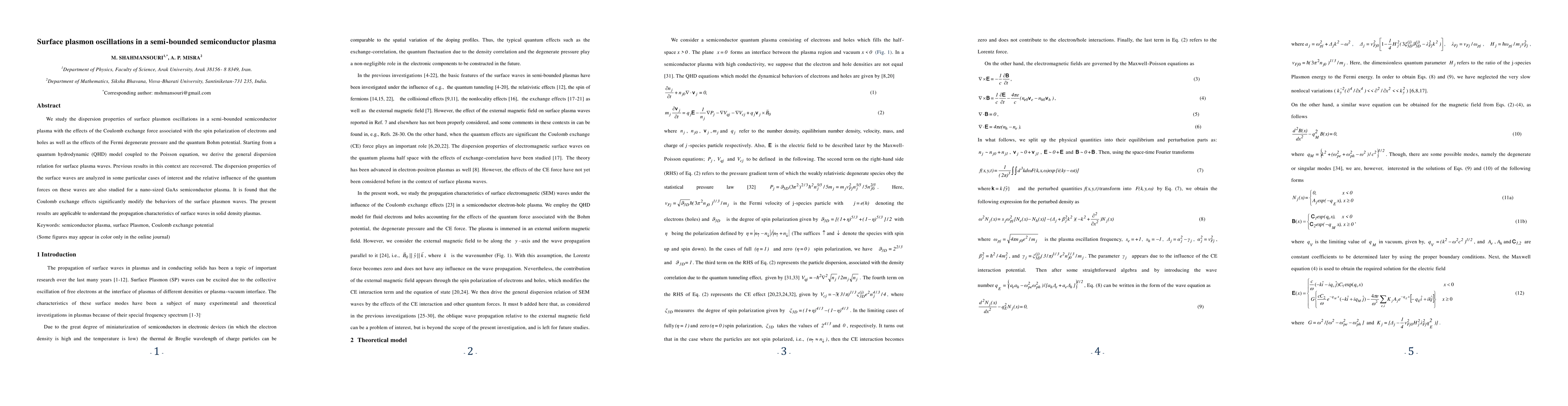 This research derives the dispersion relation for surface plasmon oscillations in a semi-bounded semiconductor plasma, considering quantum hydrodynamic effects, Coulomb exchange, and Fermi pressure. It reveals that Coulomb exchange significantly alters the behavior of surface plasmon waves, with implications for understanding surface wave propagation in dense plasmas.