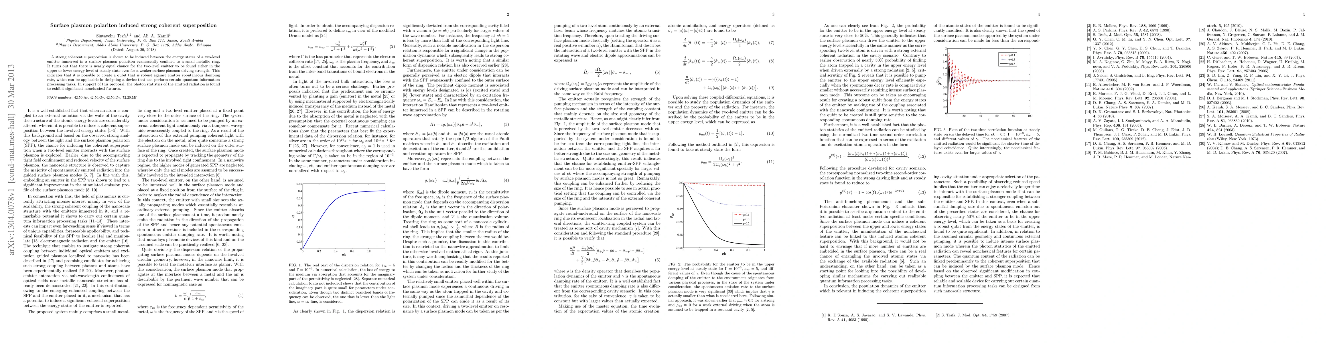 This research demonstrates a strong coherent superposition induced in a two-level emitter by surface plasmon polaritons confined in a metallic ring, leading to nearly equal probabilities of the emitter being in either energy state. This robustness against spontaneous damping suggests potential for quantum information processing applications.