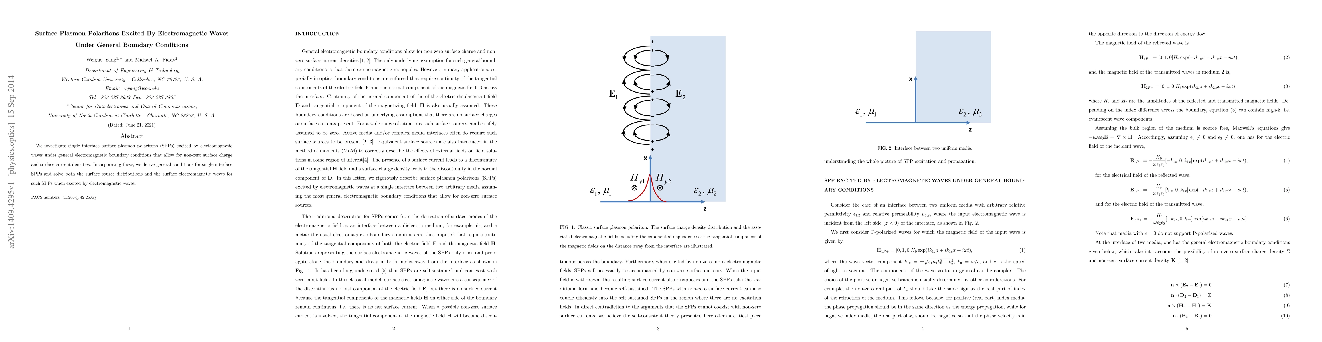 This paper investigates single interface surface plasmon polaritons excited by electromagnetic waves under general boundary conditions, deriving general conditions for their existence and solving for the source distributions and electromagnetic waves that excite them.